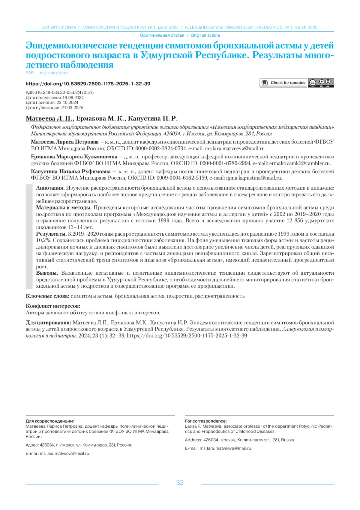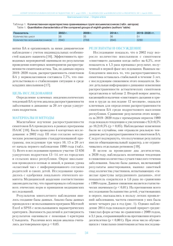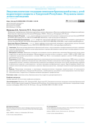 Материалы и методы. Проведены когортные исследования частоты проявления симптомов бронхиальной астмы среди подростков по протоколам программы «Международное изучение астмы и аллергии у детей» с 2002 по 2019–2020 годы и сравнение полученных результатов с итогами 1999 года. Всего в исследовании приняло участие 12 856 удмуртских школьников 13–14 лет.