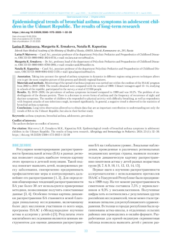 Выводы. Выявленные негативные и позитивные эпидемиологические тенденции свидетельствуют об актуальности представленной проблемы в Удмуртской Республике, о необходимости дальнейшего мониторирования статистики бронхиальной астмы у подростков и совершенствованию программ ее профилактики.