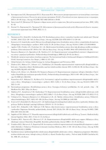 21. Бокова Т.А., Карташова Д.А., Троицкая Е.В. Заболеваемость бронхиальной астмой детей в Московской области: эпидемиологическая характеристика. РМЖ. 2022; 2: 2-5.