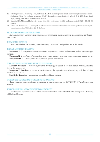 17. Ермакова М.К., Матвеева Л.П., Капустина Н.Р. Современные тенденции распространенности астмаподобных симптомов у младших школьников. Педиатрия. Приложение к журналу Consilium Medicum. 2021; 2: 138-140. DOI: 10.26442/26586630.2021.2.200990