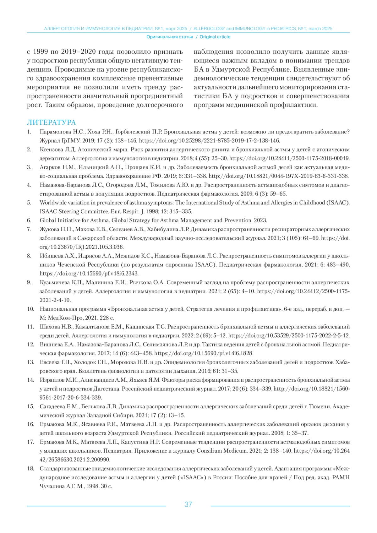 4. Намазова-Баранова Л.С., Огородова Л.М., Томилова А.Ю. и др. Распространенность астмаподобных симтомов и диагностированной астмы в популяции подростков. Педиатрическая фармакология. 2009; 6 (3): 59-65.
