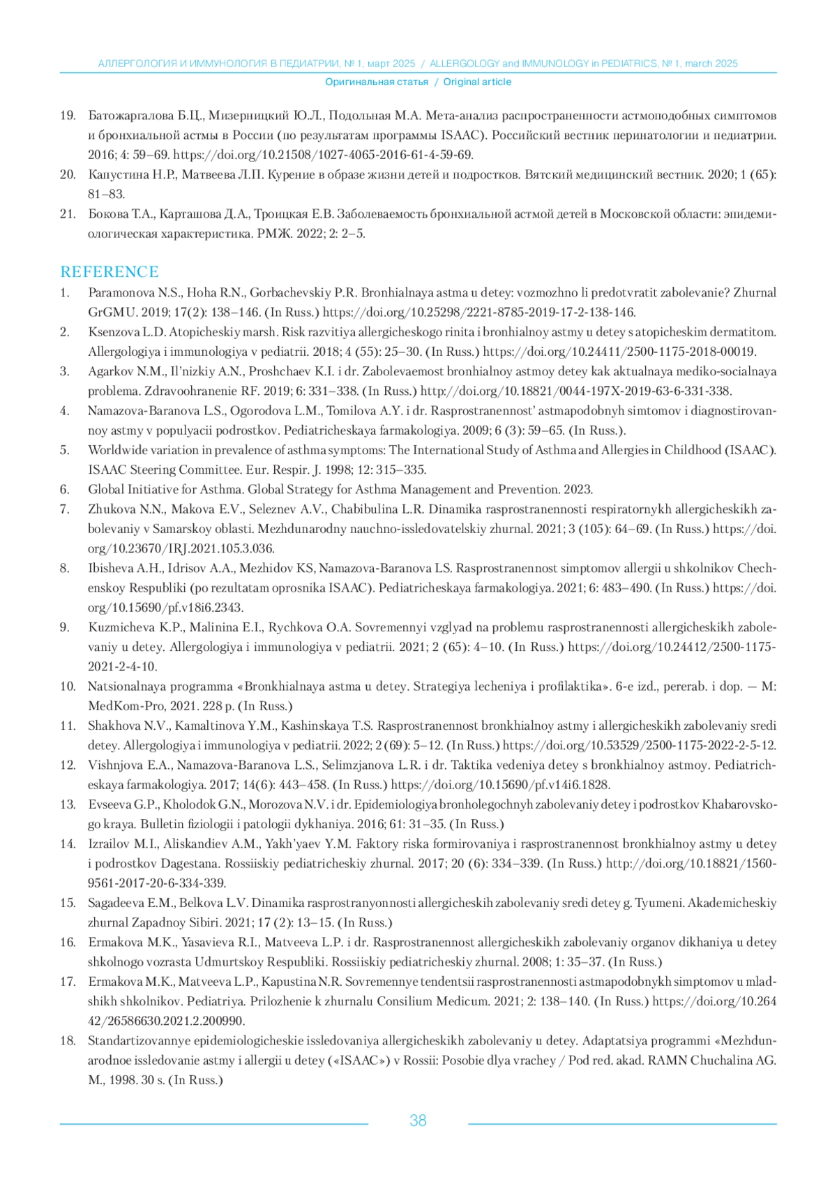 19. Батожаргалова Б.Ц., Мизерницкий Ю.Л., Подольная М.А. Мета-анализ распространенности астмоподобных симптомов и бронхиальной астмы в России (по результатам программы ISAAC). Российский вестник перинатологии и педиатрии. 2016; 4: 59-69. DOI: 10.21508/1027-4065-2016-61-4-59-69
