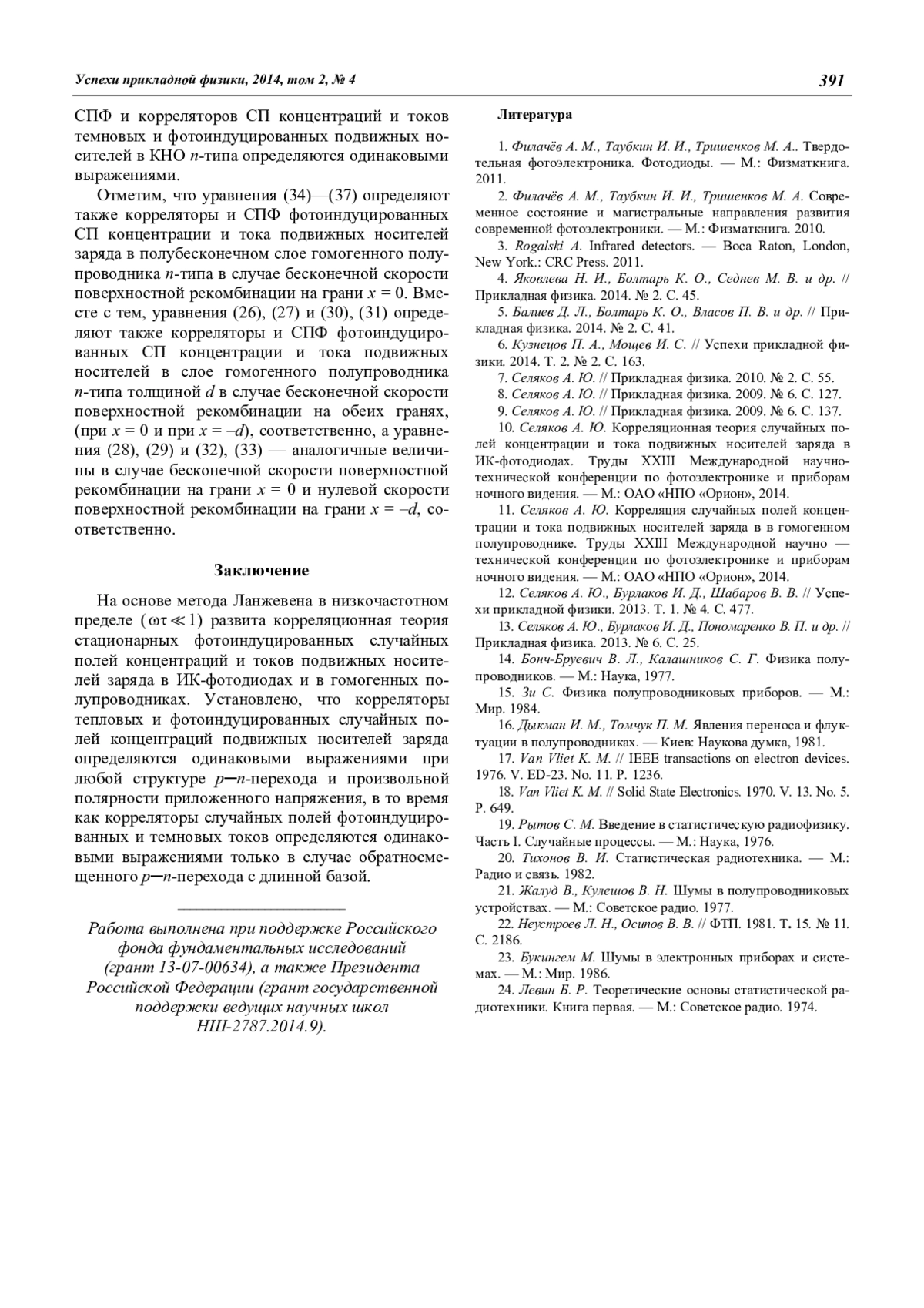 10. Селяков А. Ю. Корреляционная теория случайных полей концентрации и тока подвижных носителей заряда в ИК-фотодиодах. Труды XXIII Международной научно-технической конференции по фотоэлектронике и приборам ночного видения. — М.: ОАО «НПО «Орион», 2014.