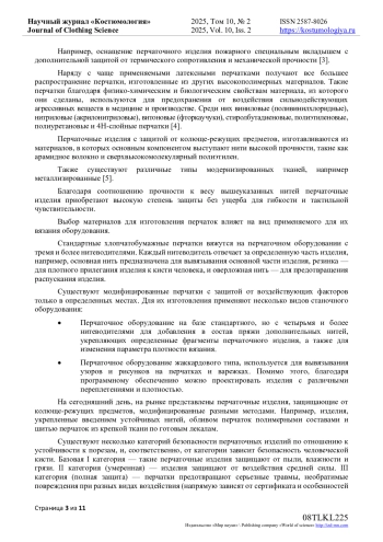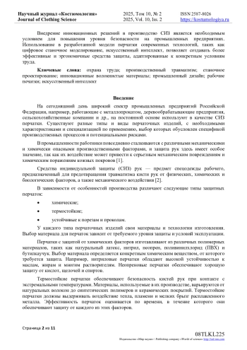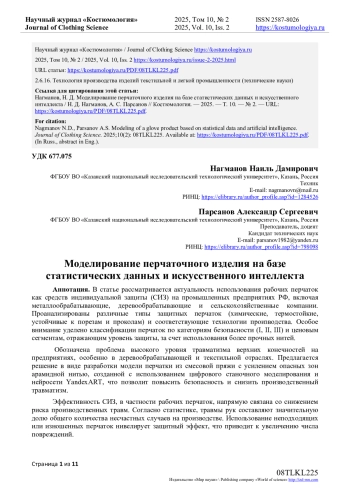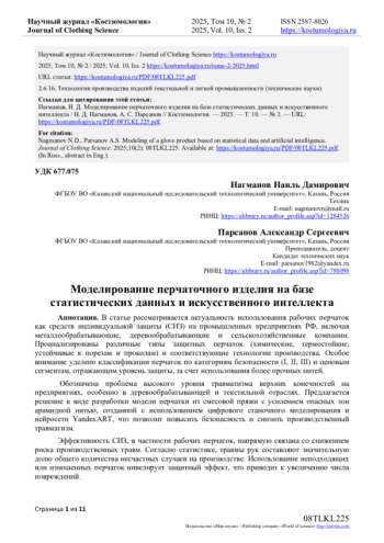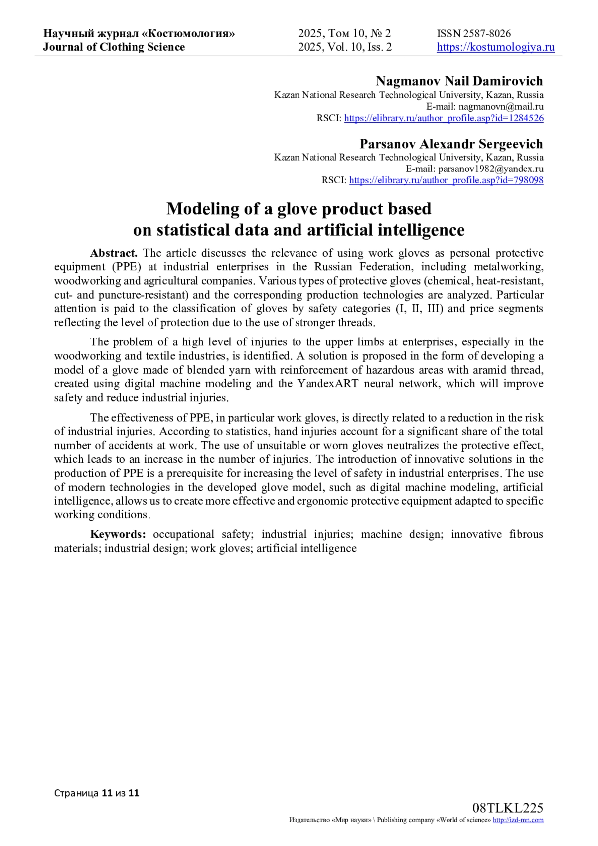 В статье рассматривается актуальность использования рабочих перчаток как средств индивидуальной защиты (СИЗ) на промышленных предприятиях РФ, включая металлообрабатывающие, деревообрабатывающие и сельскохозяйственные компании. Проанализированы различные типы защитных перчаток (химические, термостойкие, устойчивые к порезам и проколам) и соответствующие технологии производства. Особое внимание уделено классификации перчаток по категориям безопасности (I, II, III) и ценовым сегментам, отражающим уровень защиты, за счет использования более прочных нитей. Обозначена проблема высокого уровня травматизма верхних конечностей на предприятиях, особенно в деревообрабатывающей и текстильной отраслях. Предлагается решение в виде разработки модели перчатки из смесовой пряжи с усилением опасных зон арамидной нитью, созданной с использованием цифрового станочного моделирования и нейросети YandexART, что позволит повысить безопасность и снизить производственный травматизм. Эффективность СИЗ, в частности рабочих перчаток, напрямую связана со снижением риска производственных травм. Согласно статистике, травмы рук составляют значительную долю общего количества несчастных случаев на производстве. Использование неподходящих или изношенных перчаток нивелирует защитный эффект, что приводит к увеличению числа повреждений. Внедрение инновационных решений в производство СИЗ является необходимым условием для повышения уровня безопасности на промышленных предприятиях. Использование в разработанной модели перчатки современных технологий, таких как цифровое станочное моделирование, искусственный интеллект, позволяет создавать более эффективные и эргономичные средства защиты, адаптированные к конкретным условиям труда.