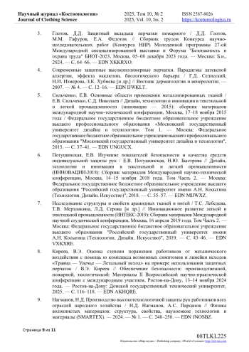 6. Потушинская, Е.В. Изучение показателей безопасности и качества средств индивидуальной защиты рук / Е.В. Потушинская, Н.Ю. Быстрова // Дизайн, технологии и инновации в текстильной и легкой промышленности (ИННОВАЦИИ-2018): Сборник материалов Международной научно-технической конференции, Москва, 14-15 ноября 2018 года. Том Часть 2. - Москва: Федеральное государственное бюджетное образовательное учреждение высшего образования “Российский государственный университет имени А.Н. Косыгина (Технологии. Дизайн. Искусство)”, 2018. - С. 55-57. EDN: MIJWXZ