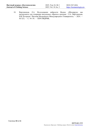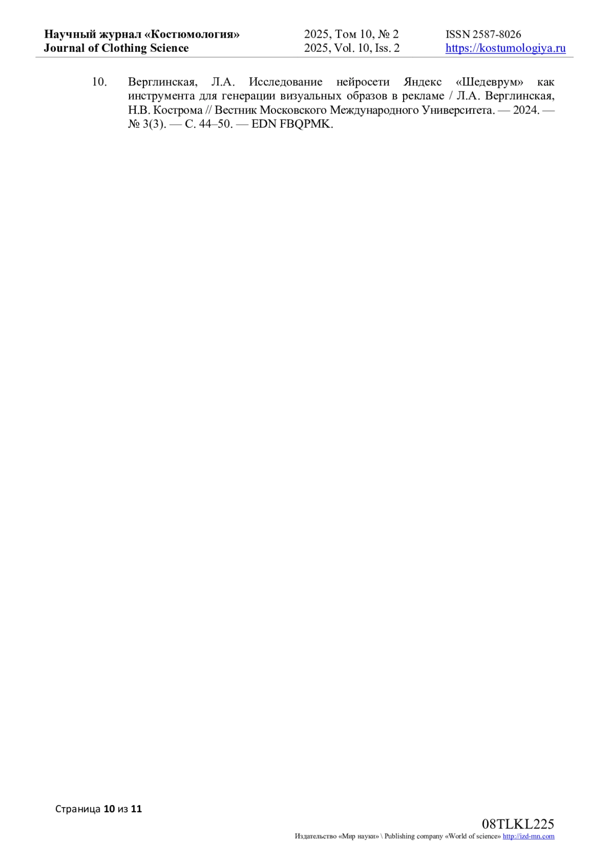 10. Верглинская, Л.А. Исследование нейросети Яндекс “Шедеврум” как инструмента для генерации визуальных образов в рекламе / Л.А. Верглинская, Н.В. Кострома // Вестник Московского Международного Университета. - 2024. - № 3(3). - С. 44-50. EDN: FBQPMK