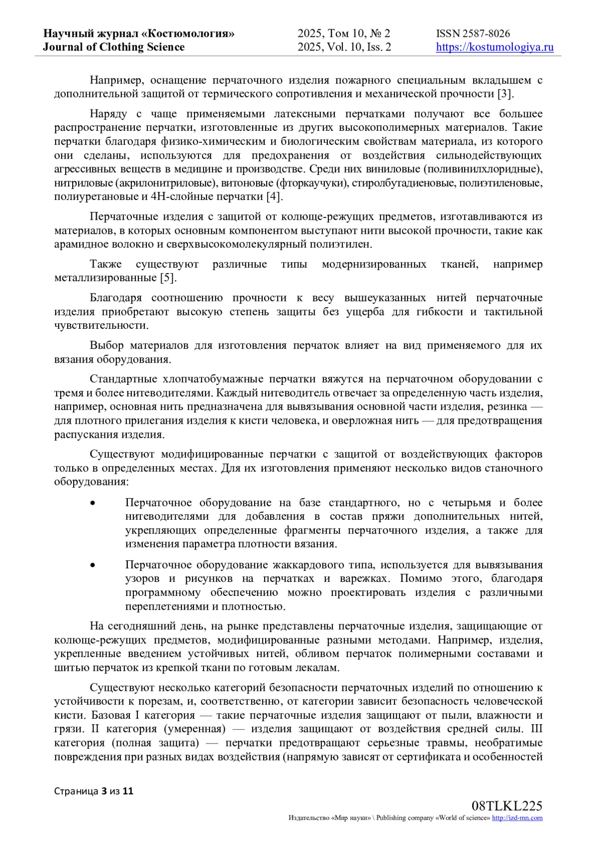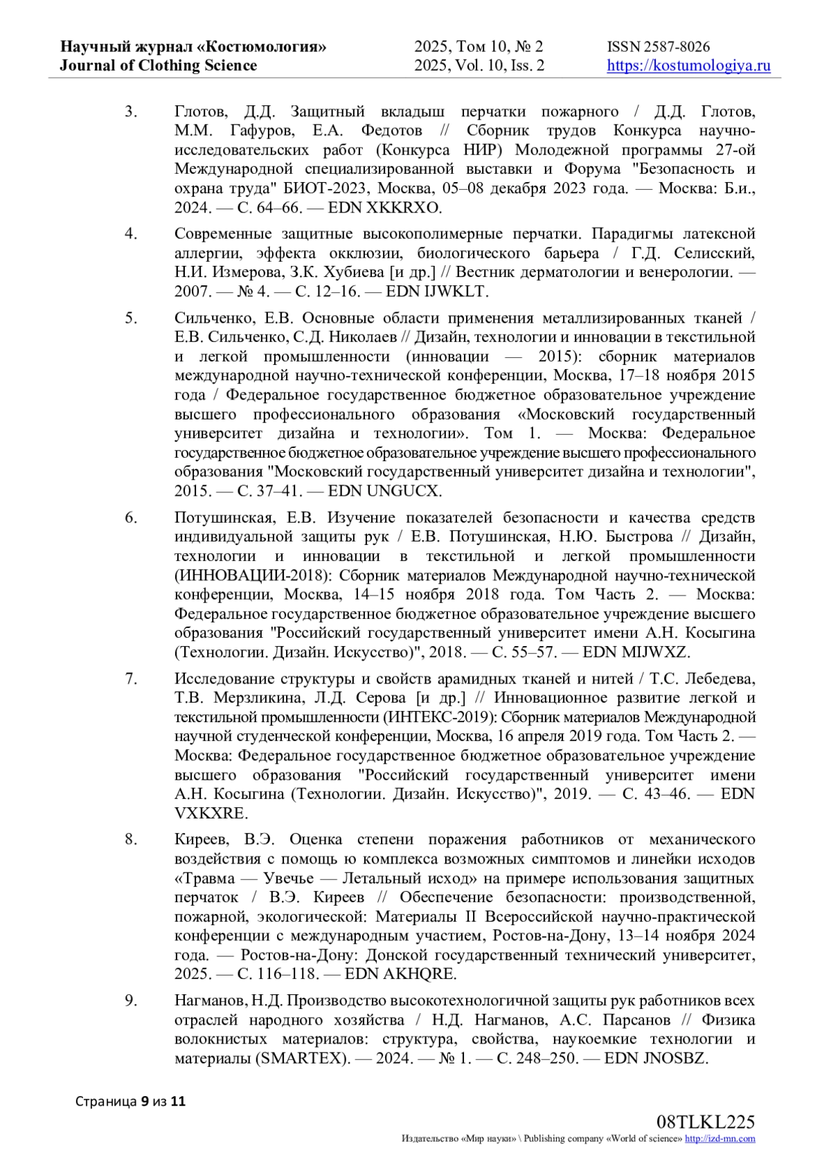 9. Нагманов, Н.Д. Производство высокотехнологичной защиты рук работников всех отраслей народного хозяйства / Н.Д. Нагманов, А.С. Парсанов // Физика волокнистых материалов: структура, свойства, наукоемкие технологии и материалы (SMARTEX). - 2024. - № 1. - С. 248-250. EDN: JNOSBZ