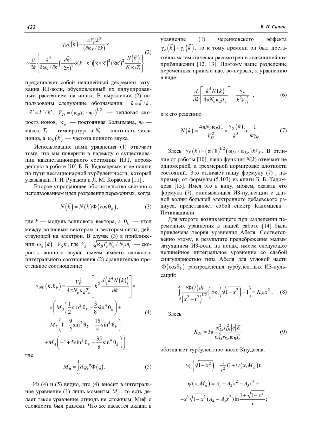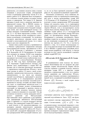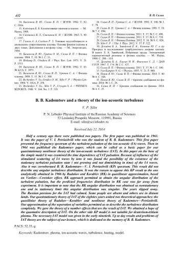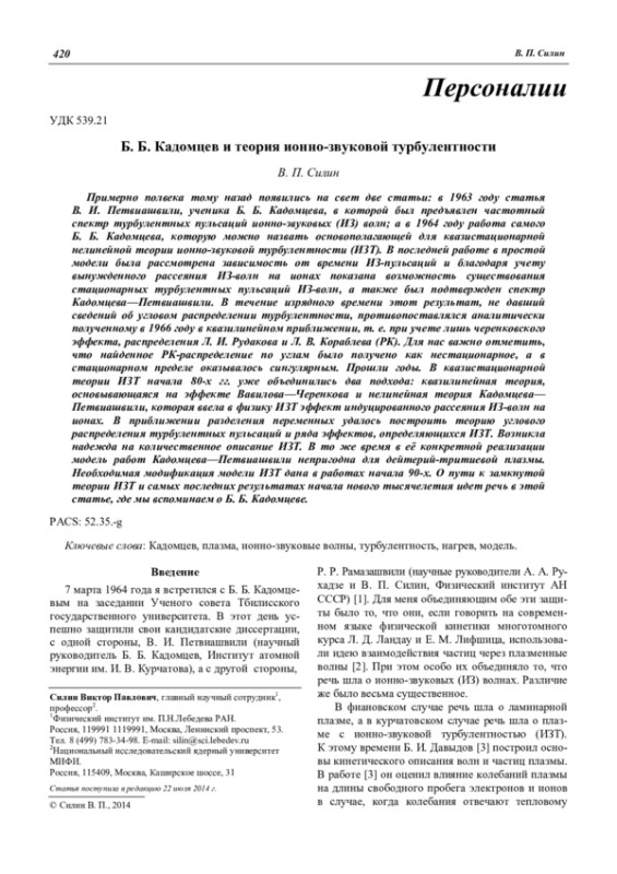 Примерно полвека тому назад появились на свет две статьи: в 1963 году статья В. И. Петвиашвили, ученика Б. Б. Кадомцева, в которой был предъявлен частотный спектр турбулентных пульсаций ионно-звуковых (ИЗ) волн; а в 1964 году работа самого Б. Б. Кадомцева, которую можно назвать основополагающей для квазистационарной нелинейной теории ионно-звуковой турбулентности (ИЗТ). В последней работе в простой модели была рассмотрена зависимость от времени ИЗ-пульсаций и благодаря учету вынужденного рассеяния ИЗ-волн на ионах показана возможность существования стационарных турбулентных пульсаций ИЗ-волн, а также был подтвержден спектр Кадомцева—Петвиашвили. В течение изрядного времени этот результат, не давший сведений об угловом распределении турбулентности, противопоставлялся аналитически полученному в 1966 году в квазилинейном приближении, т. е. при учете лишь черенковского эффекта, распределения Л. И. Рудакова и Л. В. Кораблева (РК). Для нас важно отметить, что найденное РК-распределение по углам было получено как нестационарное, а в стационарном пределе оказывалось сингулярным. Прошли годы. В квазистационарной теории ИЗТ начала 80-х гг. уже объединились два подхода: квазилинейная теория, основывающаяся на эффекте Вавилова—Черенкова и нелинейная теория Кадомцева— Петвиашвили, которая ввела в физику ИЗТ эффект индуцированного рассеяния ИЗ-волн на ионах. В приближении разделения переменных удалось построить теорию углового распределения турбулентных пульсаций и ряда эффектов, определяющихся ИЗТ. Возникла надежда на количественное описание ИЗТ. В то же время в её конкретной реализации модель работ Кадомцева—Петвиашвили непригодна для дейтерий-тритиевой плазмы. Необходимая модификация модели ИЗТ дана в работах начала 90-х. О пути к замкнутой теории ИЗТ и самых последних результатах начала нового тысячелетия идет речь в этой статье, где мы вспоминаем о Б. Б. Кадомцеве.