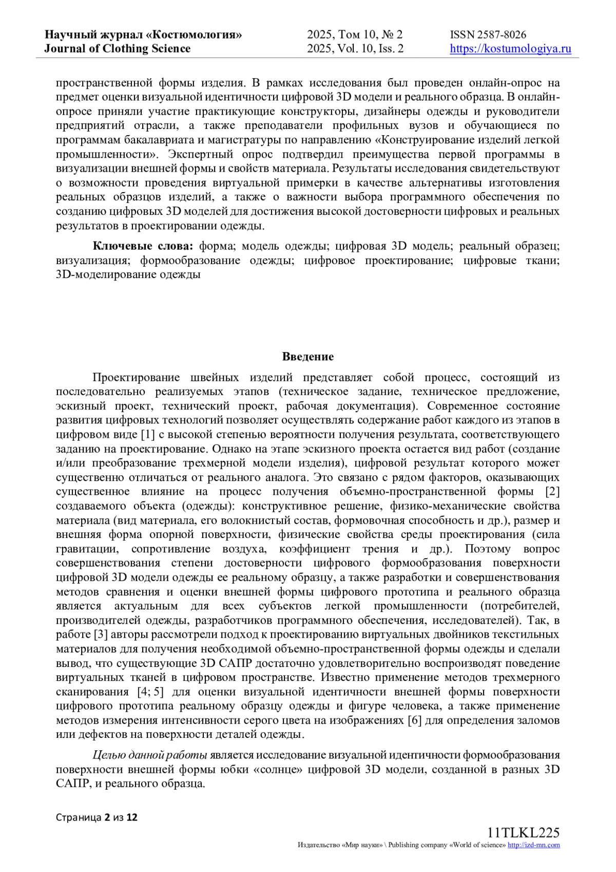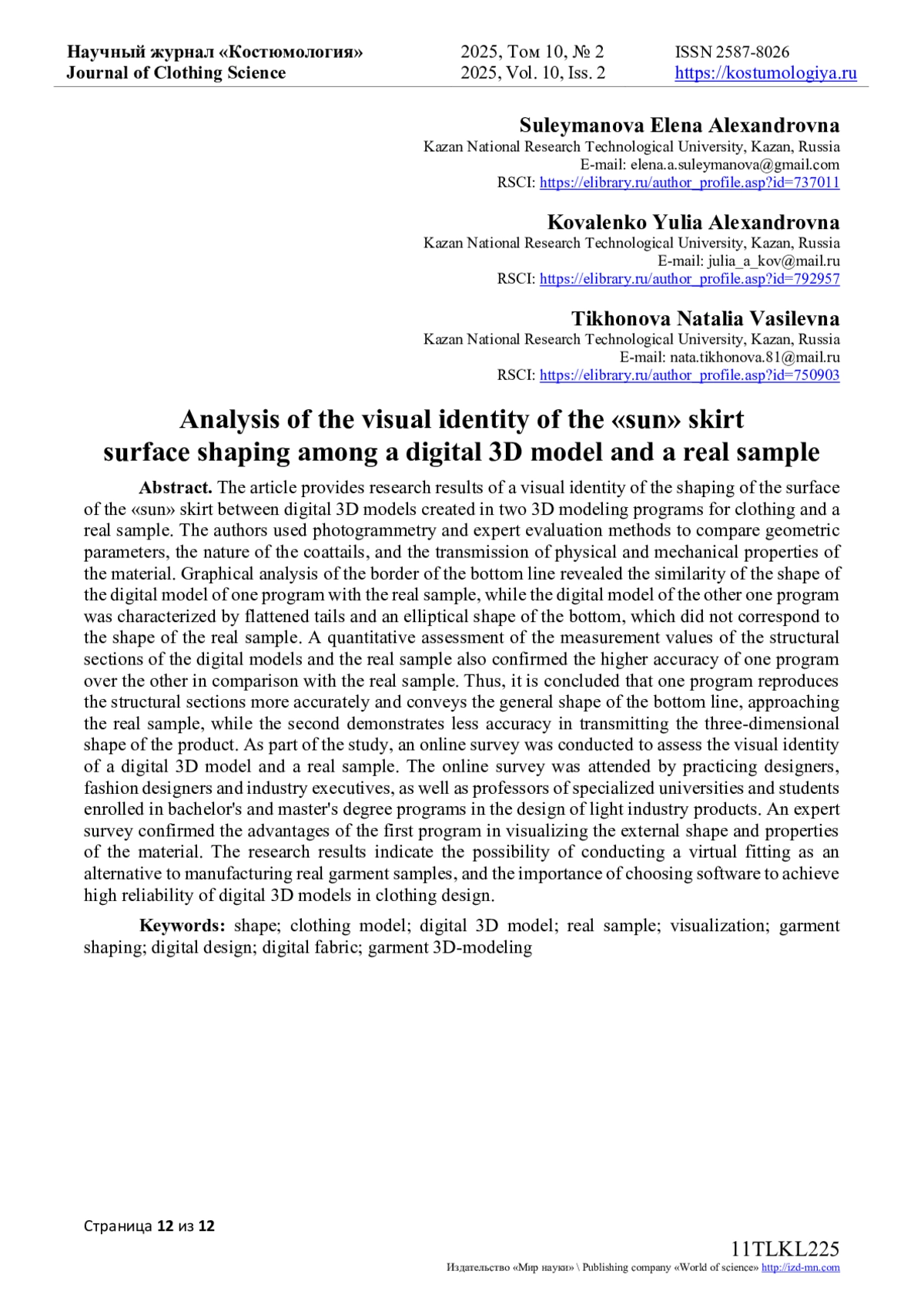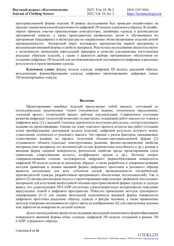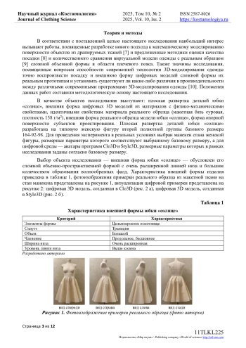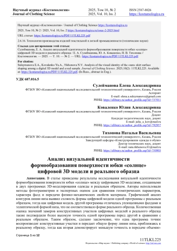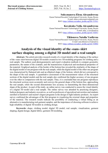 В статье приведены результаты исследования визуальной идентичности формообразования поверхности юбки «солнце» между цифровыми 3D моделями, созданными в двух программах 3D-моделирования одежды и реальным образцом. Авторы использовали методы фотограмметрии и экспертных оценок для сравнения геометрических параметров, характера фалд и передачи физико-механических свойств материала. Графический анализ контуров линии низа выявил схожесть формы цифровой модели одной программы с реальным образцом, тогда как цифровая модель другой программы отличалась уплощенными фалдами и эллиптической формой низа, что не соответствовало форме реального образца. Количественная оценка значений замеров конструктивных участков цифровых моделей и реального образца также подтвердили более высокую точность одной программы перед другой в сравнении с реальным образцом. Таким образом, сделано заключение, что одна программа точнее воспроизводит конструктивные участки и передает общую форму линии низа, приближаясь к реальному образцу, тогда как вторая демонстрирует меньшую точность в передаче объемно-пространственной формы изделия. В рамках исследования был проведен онлайн-опрос на предмет оценки визуальной идентичности цифровой 3D модели и реального образца. В онлайн-опросе приняли участие практикующие конструкторы, дизайнеры одежды и руководители предприятий отрасли, а также преподаватели профильных вузов и обучающиеся по программам бакалавриата и магистратуры по направлению «Конструирование изделий легкой промышленности». Экспертный опрос подтвердил преимущества первой программы в визуализации внешней формы и свойств материала. Результаты исследования свидетельствуют о возможности проведения виртуальной примерки в качестве альтернативы изготовления реальных образцов изделий, а также о важности выбора программного обеспечения по созданию цифровых 3D моделей для достижения высокой достоверности цифровых и реальных результатов в проектировании одежды.