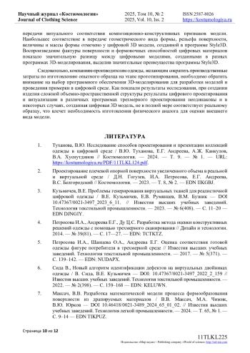 1. Туханова, В.Ю. Исследование способов проектирования и презентации коллекций одежды в цифровой среде / В.Ю. Туханова, Е.Г. Андреева, А.Ж. Канкулов, В.А. Хуснутдинов // Костюмология. - 2024. - Т. 9. - № 1. - URL: https://kostumologiya.ru/PDF/11TLKL124.pdf. EDN: RVZXRQ