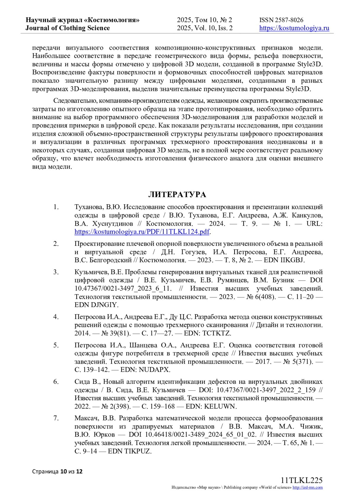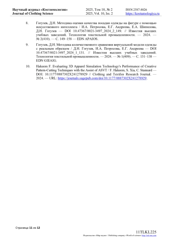 9. Гогузев, Д.Н. Методика количественного сравнения виртуальной модели одежды с реальным образцом / Д.Н. Гогузев, И.А. Петросова, Е.Г. Андреева // Известия высших учебных заведений. Технология текстильной промышленности. - 2024. - № 1(409). - С. 131-138. DOI: 10.47367/0021-3497_2024_1_131 EDN: GIEAIG