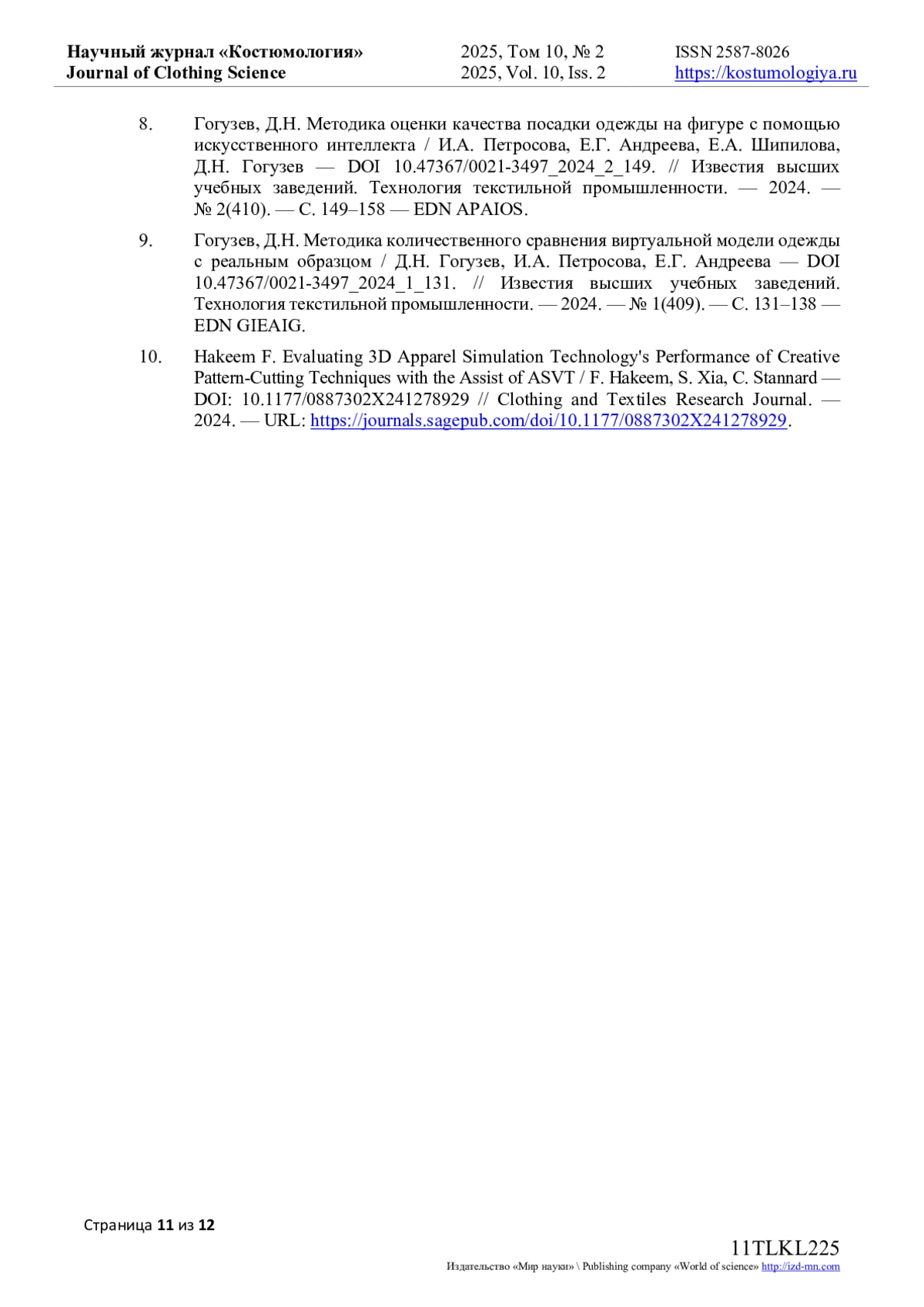 10. Hakeem F. Evaluating 3D Apparel Simulation Technology’s Performance of Creative Pattern-Cutting Techniques with the Assist of ASVT / F. Hakeem, S. Xia, C. Stannard - // Clothing and Textiles Research Journal. - 2024. - URL: https://journals.sagepub.com/doi/. DOI: 10.1177/0887302X241278929 EDN: EFCECH