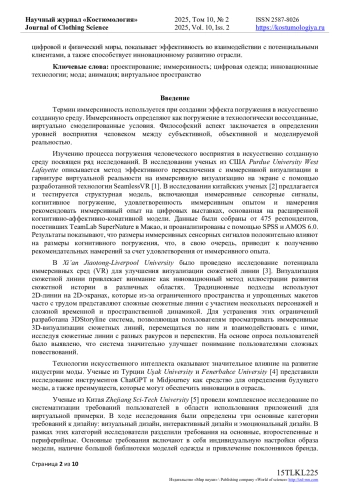 В статье приведены результаты исследования визуальной идентичности формообразования поверхности юбки «солнце» между цифровыми 3D моделями, созданными в двух программах 3D-моделирования одежды и реальным образцом. Авторы использовали методы фотограмметрии и экспертных оценок для сравнения геометрических параметров, характера фалд и передачи физико-механических свойств материала. Графический анализ контуров линии низа выявил схожесть формы цифровой модели одной программы с реальным образцом, тогда как цифровая модель другой программы отличалась уплощенными фалдами и эллиптической формой низа, что не соответствовало форме реального образца. Количественная оценка значений замеров конструктивных участков цифровых моделей и реального образца также подтвердили более высокую точность одной программы перед другой в сравнении с реальным образцом. Таким образом, сделано заключение, что одна программа точнее воспроизводит конструктивные участки и передает общую форму линии низа, приближаясь к реальному образцу, тогда как вторая демонстрирует меньшую точность в передаче объемно-пространственной формы изделия. В рамках исследования был проведен онлайн-опрос на предмет оценки визуальной идентичности цифровой 3D модели и реального образца. В онлайн-опросе приняли участие практикующие конструкторы, дизайнеры одежды и руководители предприятий отрасли, а также преподаватели профильных вузов и обучающиеся по программам бакалавриата и магистратуры по направлению «Конструирование изделий легкой промышленности». Экспертный опрос подтвердил преимущества первой программы в визуализации внешней формы и свойств материала. Результаты исследования свидетельствуют о возможности проведения виртуальной примерки в качестве альтернативы изготовления реальных образцов изделий, а также о важности выбора программного обеспечения по созданию цифровых 3D моделей для достижения высокой достоверности цифровых и реальных результатов в проектировании одежды.