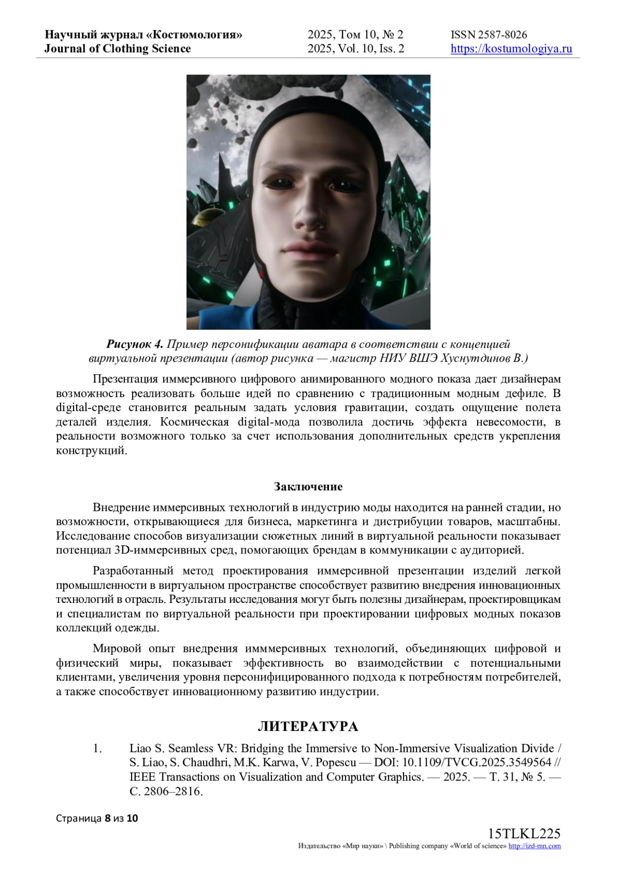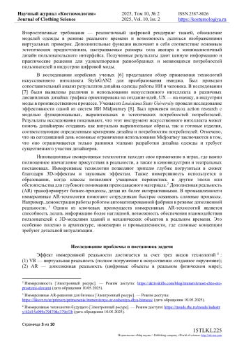 9. Бородина Е.В. Исследование влияния Computer-Generated Imagery на индустрию моды / Е.В. Бородина, В.Ю. Туханова // Костюмология. - 2024. - Т. 9, № 2. - URL: https://kostumologiya.ru/PDF/28TLKL224.pdf. EDN: GRQCSP