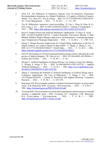 5. Zhang Y. Design Resource Deployment for Virtual Fitting Applications in the Era of Digital Fashion: An Analysis Based on Kano-QFD / Y. Zhang, Z. Zheng, L. Liu - // SAGE Open. - 2024. - Т. 14, № 4. - URL: https://journals.sagepub.com/doi/. DOI: 10.1177/21582440241296627 EDN: BXLDMA