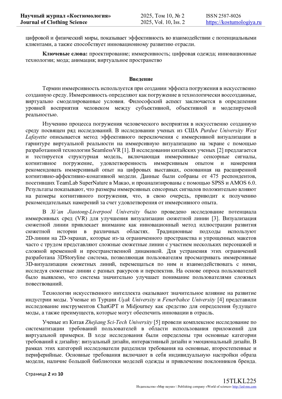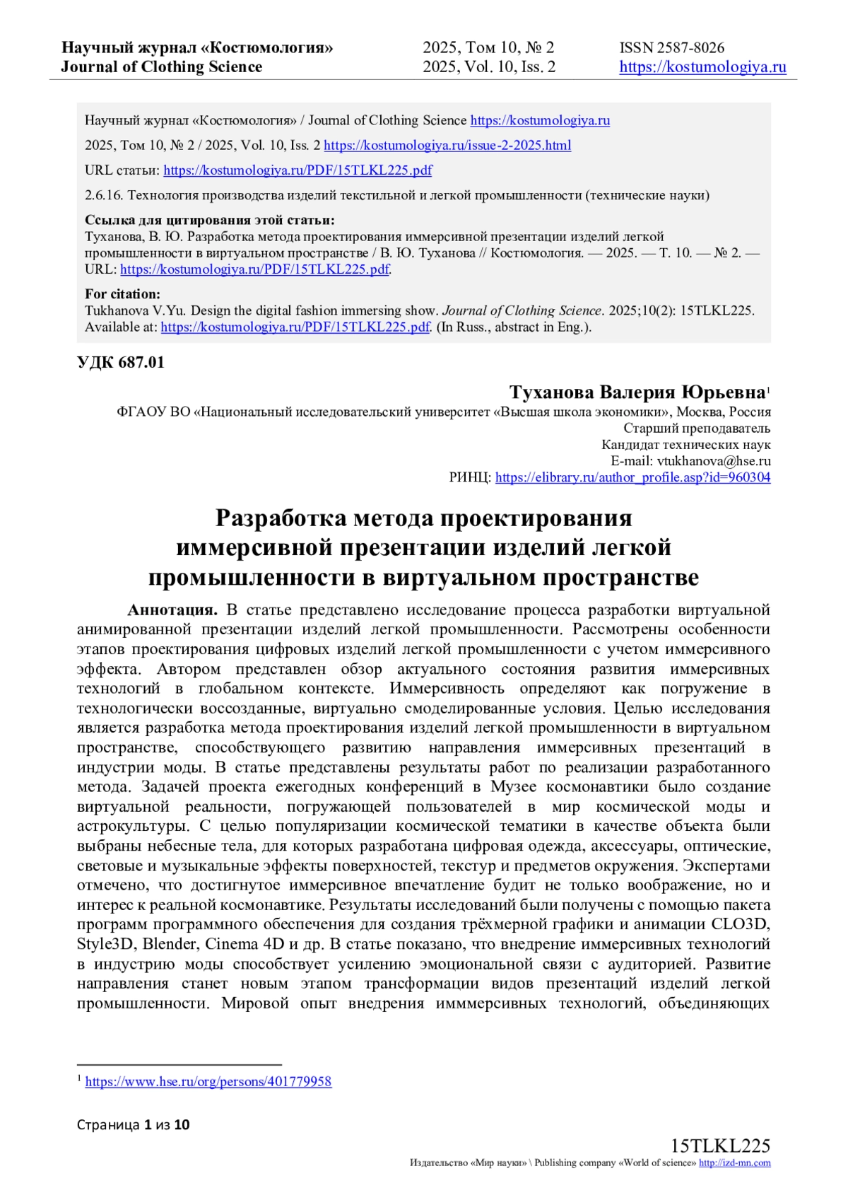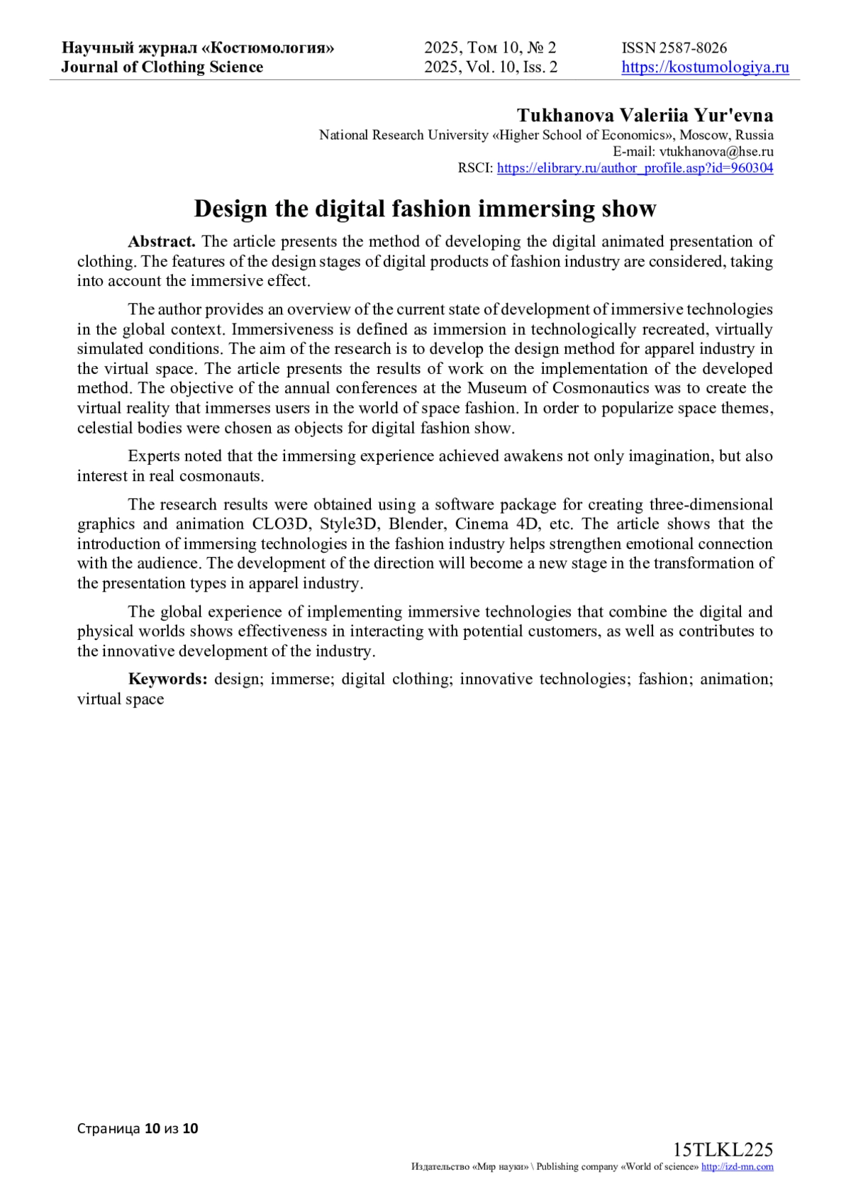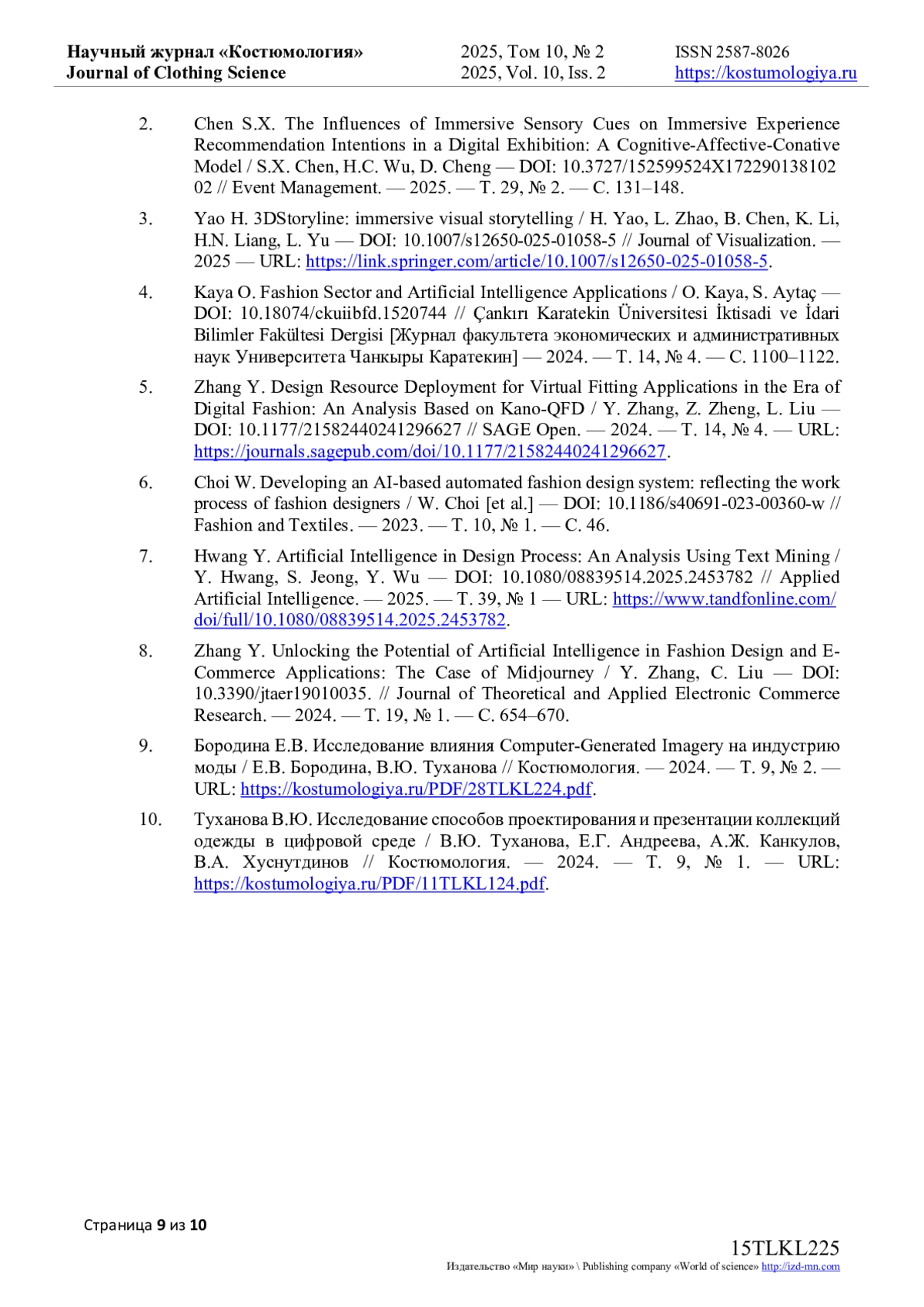 10. Туханова В.Ю. Исследование способов проектирования и презентации коллекций одежды в цифровой среде / В.Ю. Туханова, Е.Г. Андреева, А.Ж. Канкулов, В.А. Хуснутдинов // Костюмология. - 2024. - Т. 9, № 1. - URL: https://kostumologiya.ru/PDF/11TLKL124.pdf. EDN: RVZXRQ