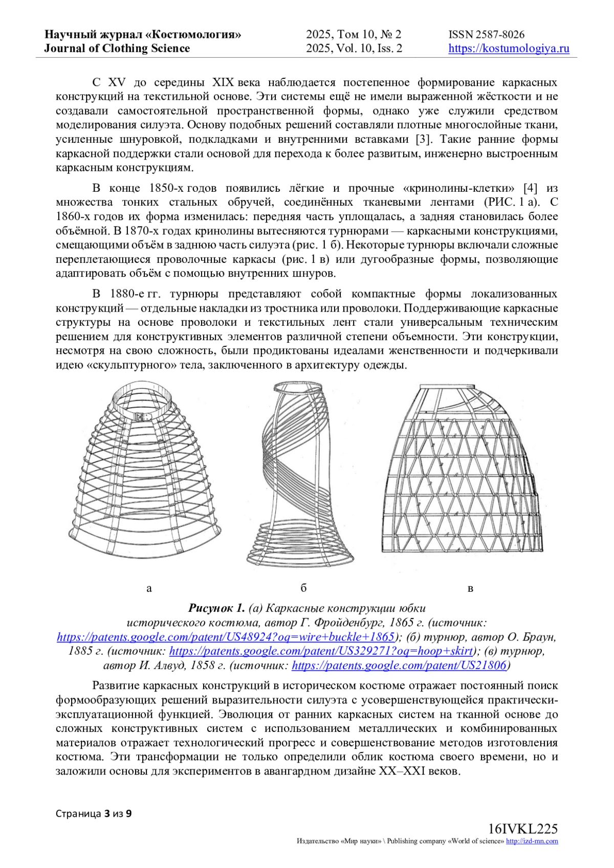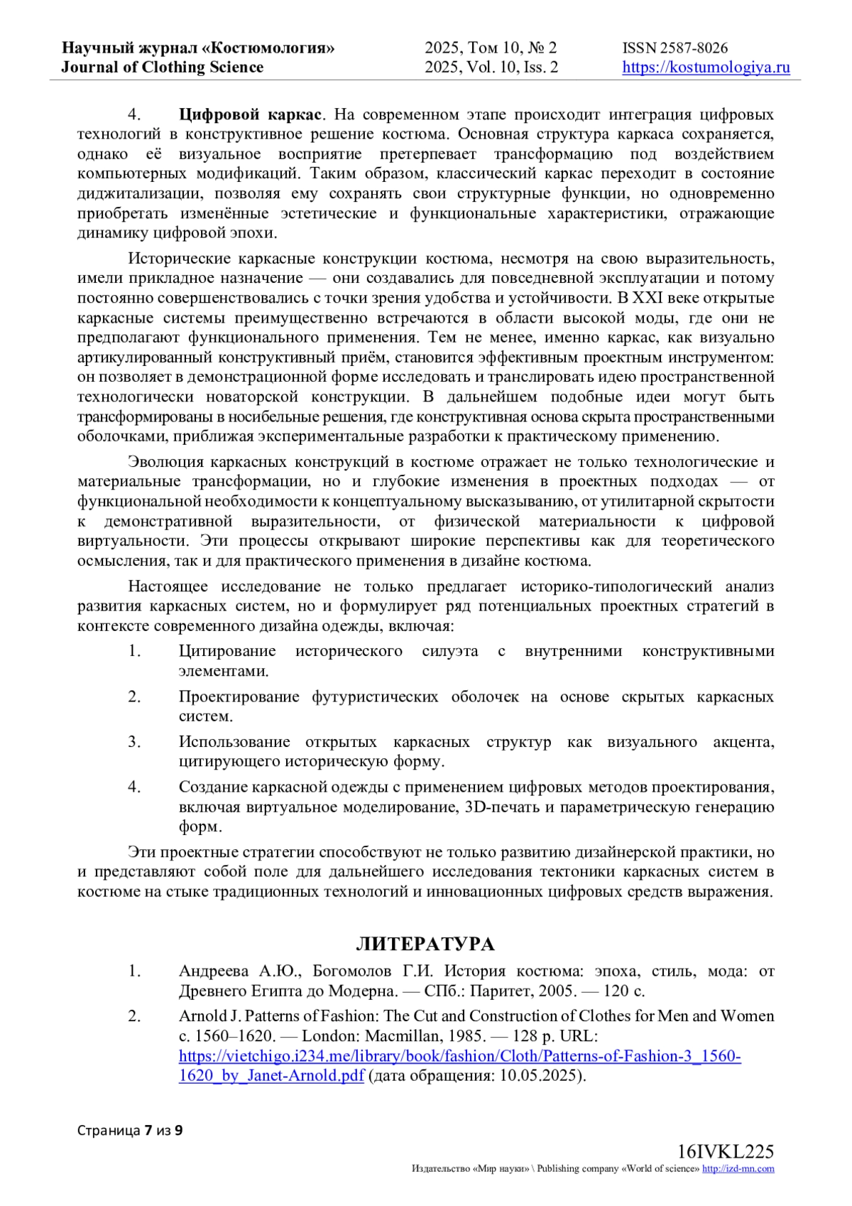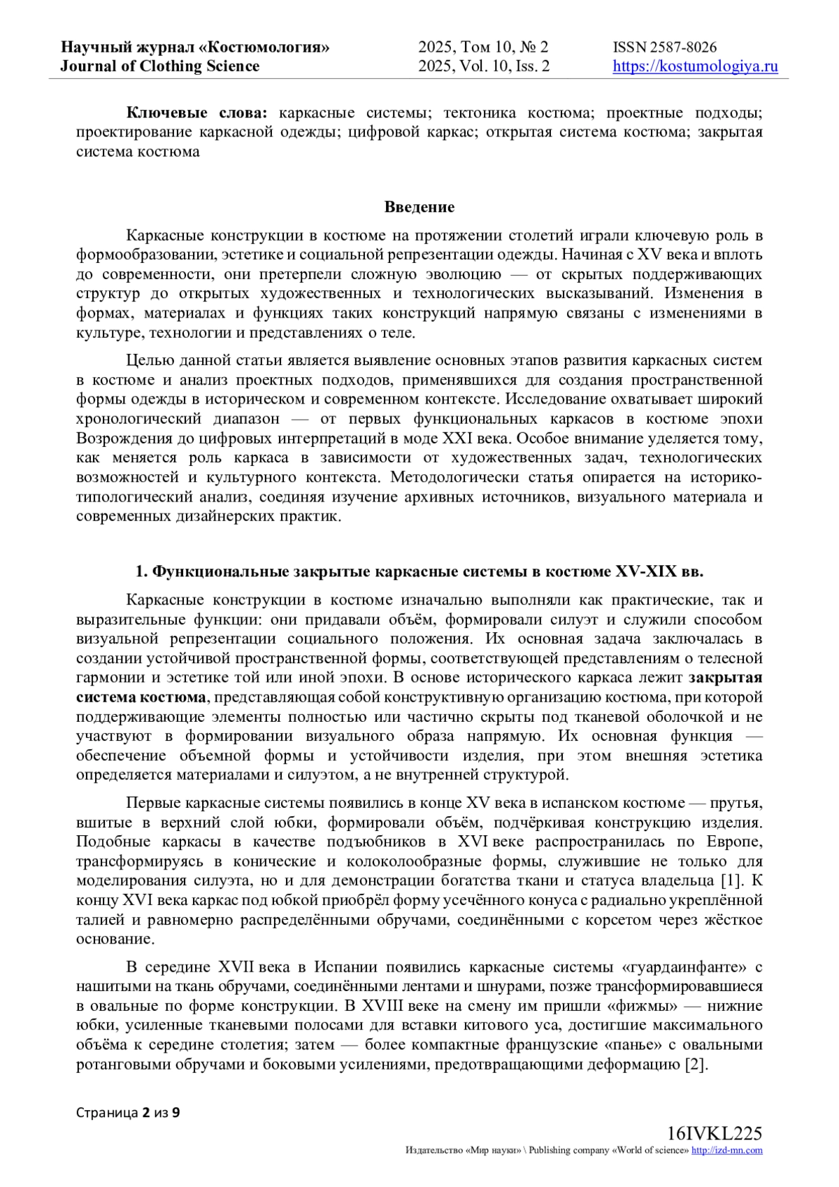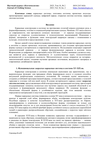 Статья посвящена исследованию развития каркасных систем костюма с XV по XXI век и направлена на выявление того, как менялись конструкции, подходы к их проектированию и смысловая нагрузка каркаса в разные эпохи - от скрытой поддерживающей структуры к открытой архитектоничной форме. Исследование развития каркасных конструкций позволило провести систематизацию каркасных форм на основе функциональных, художественных и технологических преобразований, выделив четыре этапа: формирование и развитие функциональных каркасных систем в костюме XV-XIX веков; художественные и инженерные эксперименты в каркасных формах XX века; становление открытых каркасных конструкций как самостоятельного выразительного средства в XXI веке; цифровая трансформация каркаса как элемента современной моды. Выявляется тенденция к интеграции каркасных решений в междисциплинарные художественные практики на стыке моды, инженерии и цифровых технологий. Настоящее исследование сочетает историко-типологический анализ эволюции каркасных систем костюма с выработкой четырёх ключевых проектных стратегий современного дизайна одежды: интеграция исторического силуэта с внутренними конструктивными элементами; проектирование футуристических «оболочек» на базе скрытых каркасных систем; применение открытых каркасных структур как визуального акцента, отсылающего к традиционным формам; использование цифровых технологий (виртуальное моделирование, 3D-печать, параметрическая генерация) для создания новых каркасных форм. Данные подходы расширяют горизонты дизайнерской практики и открывают перспективы дальнейшего исследования тектоники каркасных систем на стыке традиционных и цифровых технологий.
