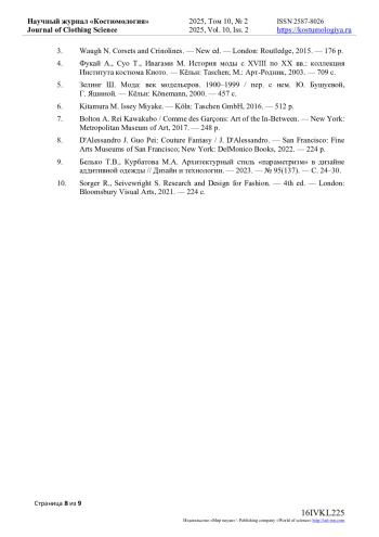 9. Белько Т.В., Курбатова М.А. Архитектурный стиль “параметризм” в дизайне аддитивной одежды // Дизайн и технологии. - 2023. - № 95(137). - С. 24-30. EDN: EZSMZS