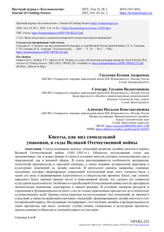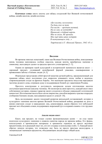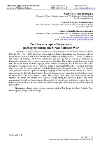 Статья посвящена анализу тенденций развития дизайна кисетов в период Великой Отечественной войны (1941-1945 гг.). Объектом исследования стали как традиционные, так и новые формы и стили в создании кисетов, которые использовались как в гражданской, так и военной сферах. В статье рассматриваются особенности материалов, технологий производства и цветовой палитры, а также влияние исторических факторов и культурных изменений на дизайн кисетов. В результате анализа выявлены основные тенденции, которые сформировали уникальный эстетический язык этого элемента быта, а также его роль в формировании идентичности и свидетельстве времени. Кисет, как элемент народного быта, занимал важное место в повседневной жизни, что сделало его символом культурной идентичности. Особенно в годы Великой Отечественной войны кисеты претерпели значительные изменения, адаптируясь к новым реалиям. В условиях нехватки ресурсов и стремления к функциональности кисет стал не только практичным предметом, но и носителем художественных идей. Данная статья нацелена на исследование этих изменений, их причин и следствий, а также на выявление ключевых тенденций, сформировавших дизайн кисетов в этот исторический период. Исследование подчеркивает, что изучение дизайна и функциональности таких предметов, как кисет, помогает глубже понять социальные и культурные процессы, происходившие в обществе в сложный период его истории.