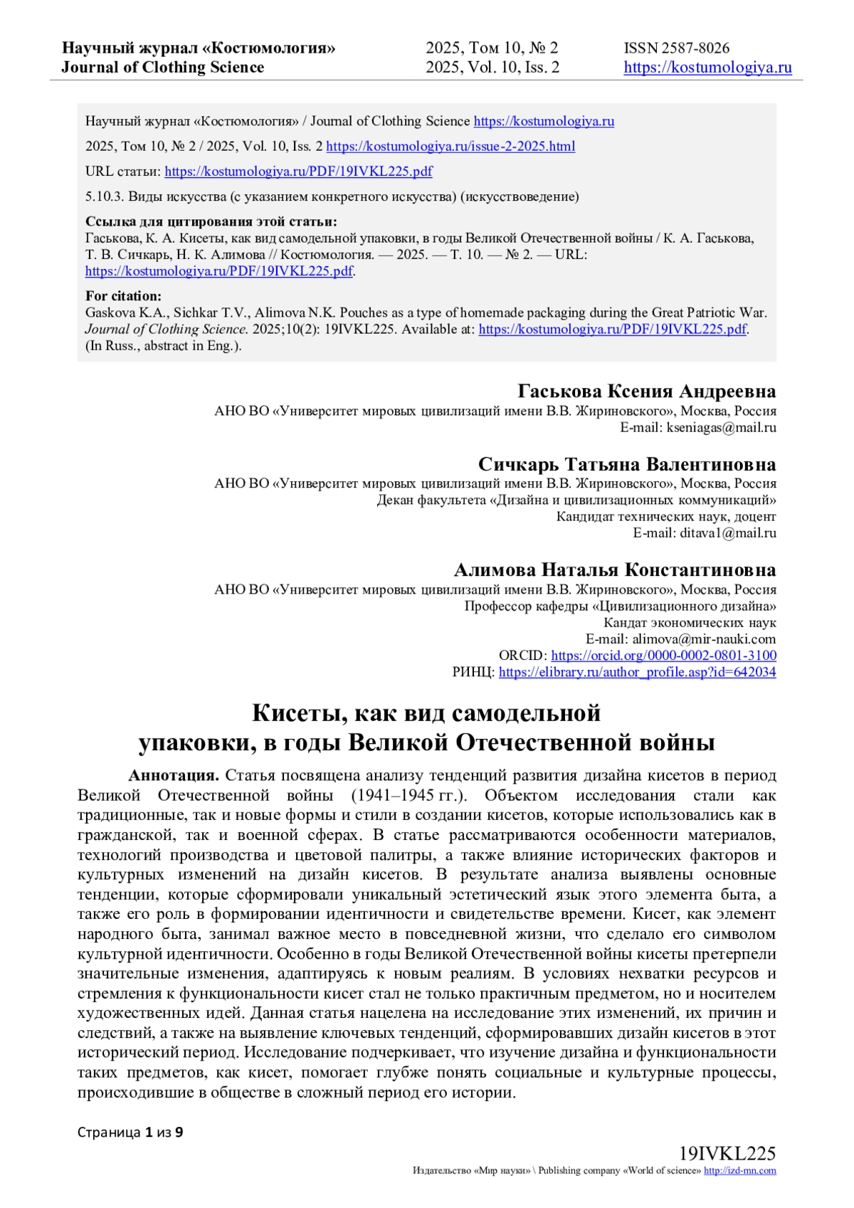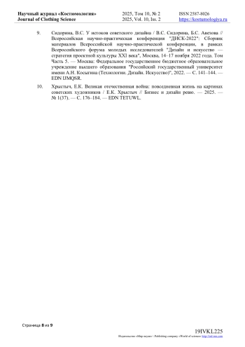 9. Сидорина, В.С. У истоков советского дизайна / В.С. Сидорина, Б.С. Авезова // Всероссийская научно-практическая конференция “ДИСК-2022”: Сборник материалов Всероссийской научно-практической конференции, в рамках Всероссийского форума молодых исследователей “Дизайн и искусство - стратегия проектной культуры XXI века”, Москва, 14-17 ноября 2022 года. Том Часть 5. - Москва: Федеральное государственное бюджетное образовательное учреждение высшего образования “Российский государственный университет имени А.Н. Косыгина (Технологии. Дизайн. Искусство)”, 2022. - С. 141-144. EDN: IJMQSR