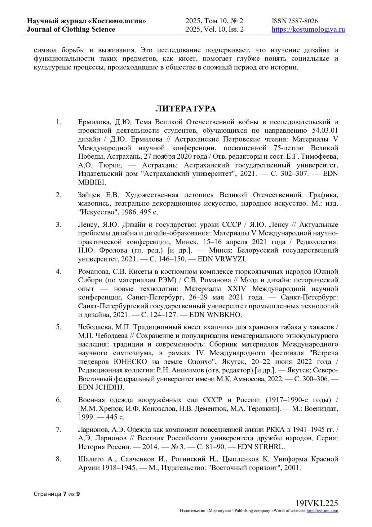 7. Ларионов, А.Э. Одежда как компонент повседневной жизни РККА в 1941-1945 гг. / А.Э. Ларионов // Вестник Российского университета дружбы народов. Серия: История России. - 2014. - № 3. - С. 81-90. EDN: STRHRL