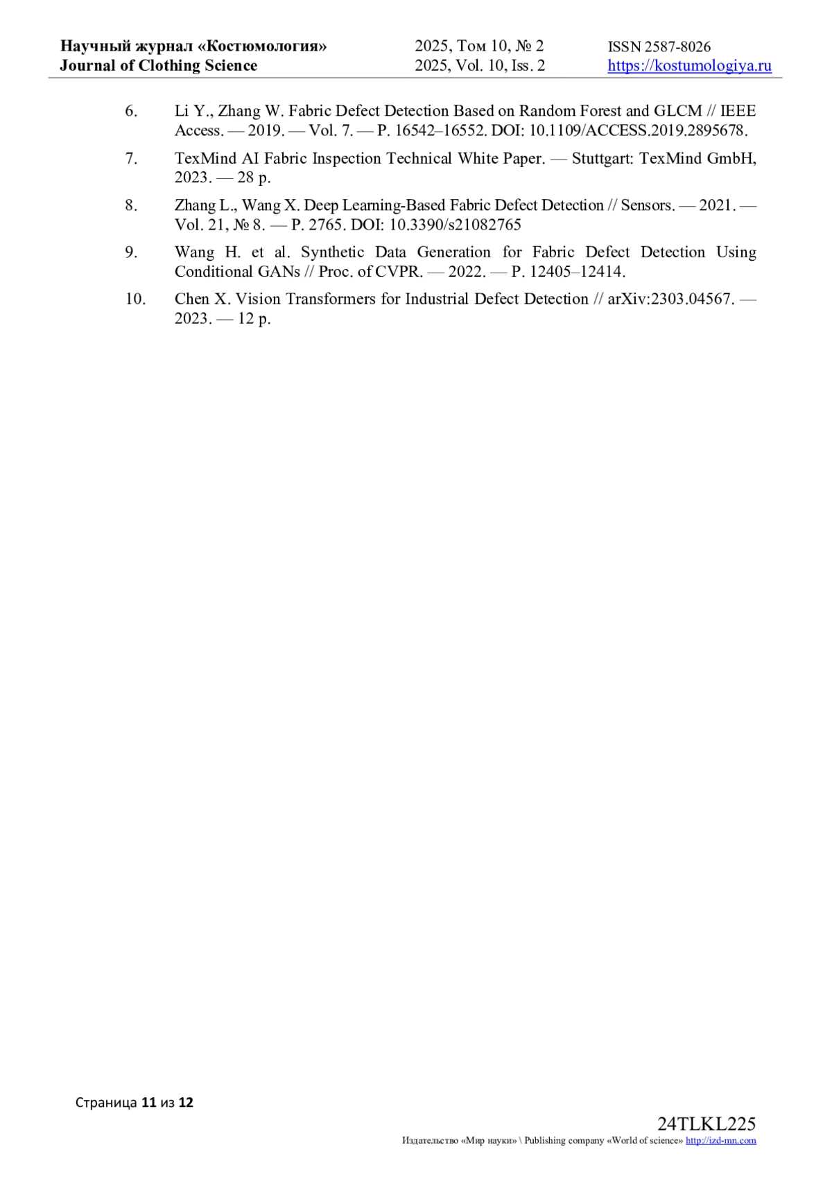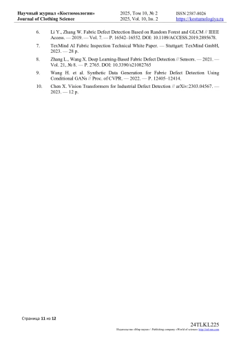 8. Zhang L., Wang X. Deep Learning-Based Fabric Defect Detection // Sensors. - 2021. - Vol. 21, № 8. - P. 2765. DOI: 10.3390/s21082765