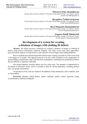 В статье подробно представлена методика создания специализированной базы данных изображений дефектов посадки одежды с использованием пассивных методов сбора визуальной информации. Исследование охватывает три основных подхода: поиск, по ключевым словам, анализ архивов производственного брака швейных фабрик и сбор пользовательских изображений с торговых онлайн платформ. Пассивные методы продемонстрировали свою эффективность, позволив за 3 месяца собрать более 2 500 изображений, детально показывающих различные типов дефектов. Такой подход оказался менее затратным по сравнению с организацией специальных съемок и показал огромное преимущество. Особую ценность представляют данные полученные с маркетплейсов, отражающие реальные эксплуатационные проблемы, которые сложно воспроизвести искусственно в лабораторных условиях. Созданная база данных классифицирует дефекты по пяти основным типам: горизонтальные складки, вертикальные складки, наклонные складки, угловые заломы. База данных реализована в формате интерактивных форм, предусмотрена возможность фильтрации по нескольким параметрам, включая тип изделия, размерную группу и материал. Перспективы работы связаны с дополнением базы данными, полученными активными методами, такими как 3D-моделирование, что позволит охватить редкие и сложные виды дефектов, которые имеют важное значение для полноценного исследования проблем, возникающих при посадки одежды. Полученные результаты исследования представляют практическую выгоду для производства одежды, экспериментального цеха, а также для разработчиков систем автоматизированного контроля качества продукции.