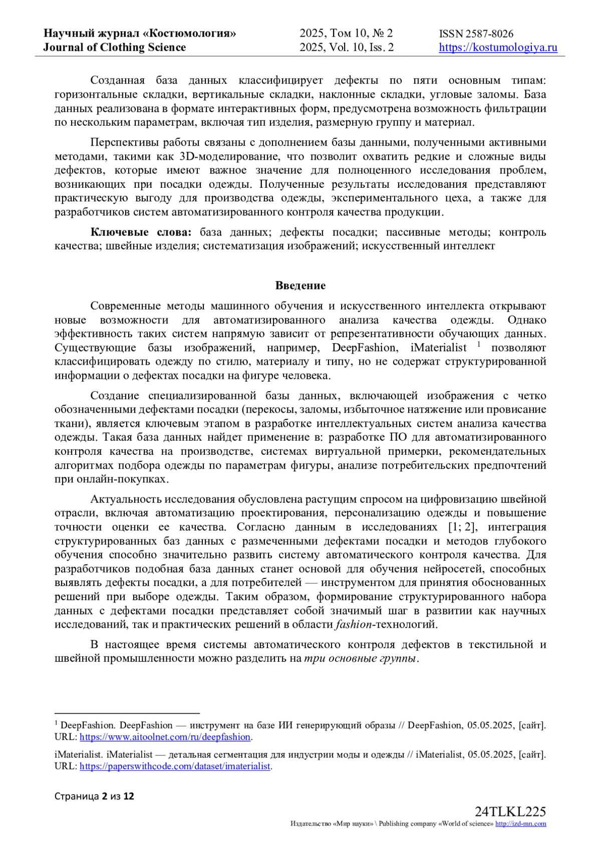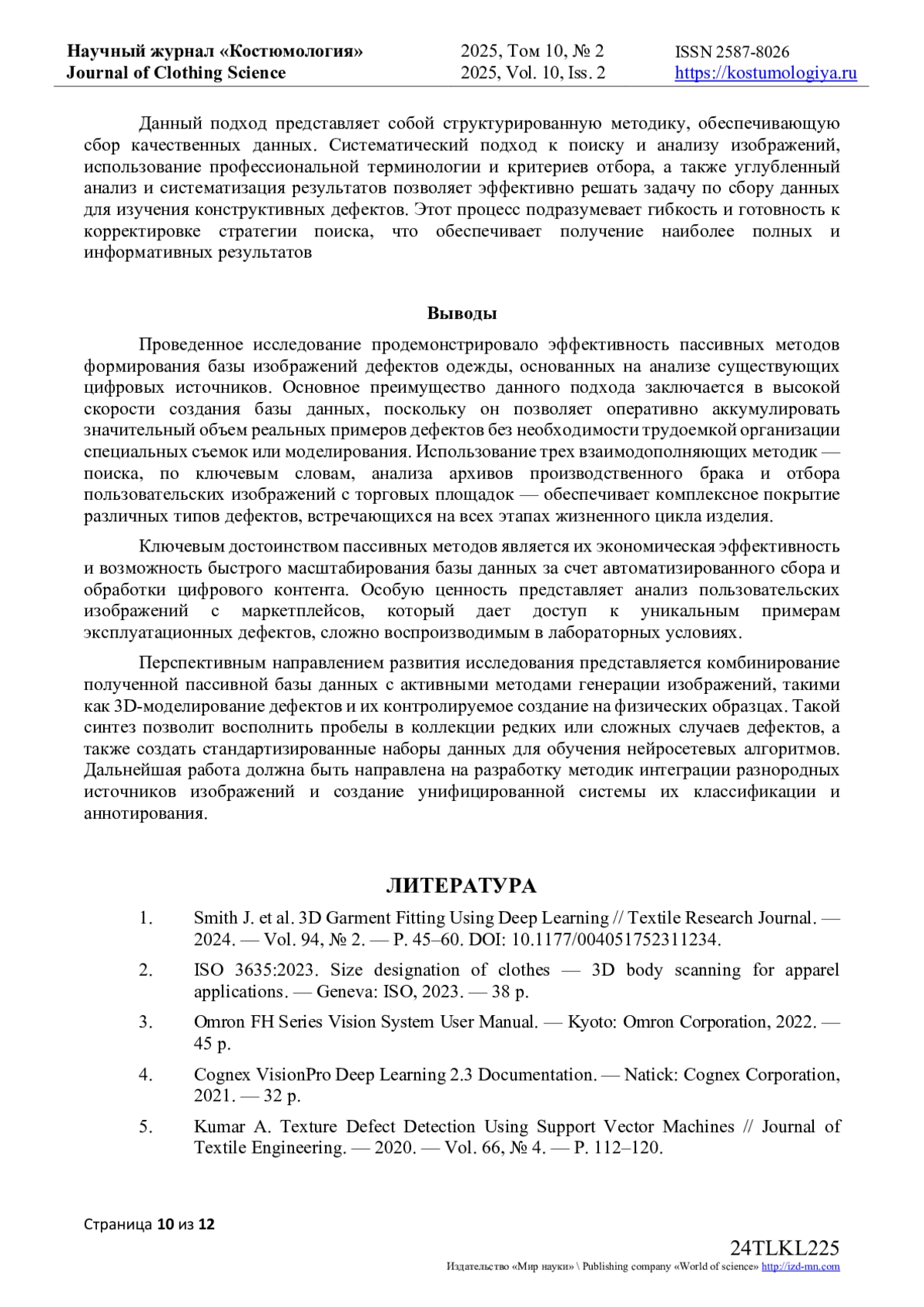 1. Smith J. et al. 3D Garment Fitting Using Deep Learning // Textile Research Journal. - 2024. - Vol. 94, № 2. - P. 45-60. DOI: 10.1177/004051752311234