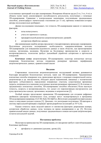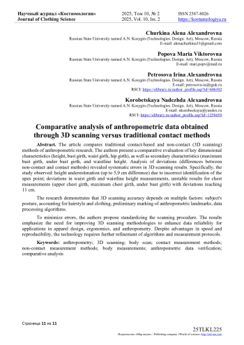 Статья посвящена сравнению традиционных контактных и бесконтактных (3D-сканирование) методов проведения антропометрических исследований. Авторами представлена сравнительная оценка ключевых размерных признаков: роста, обхвата груди 3-го, обхвата талии, обхвата бедер, а также подчиненных признаков: обхвата груди 2-го, обхвата груди 4-го и высоты линии талии. Анализ отклонений (разницы между бесконтактным и контактным методом) выявил систематические ошибки, появляющиеся в результатах 3D-сканирования. В частности, наблюдается уменьшение значений роста и высоты линии талии (разница до 5,9 см), связанное с неправильным определением верхушечной точки и изменением естественных пропорций тела при сканировании. Измерения обхватов груди (2-го, 3-го, 4-го) и обхвата талии также демонстрируют нестабильность результатов, полученных с помощью 3D-сканирования. Сравнение с контрольными значениями, полученными традиционным способом, демонстрирует значительные отклонения (до 11 см), причины появления которых авторы последовательно разбирают. Данное исследование показывает, что точность 3D-сканирования зависит от множества факторов: · позы испытуемого; · учета его прически и одежды; · предварительной разметки антропометрических уровней; · алгоритмов обработки данных. Для минимизации ошибок авторы предлагают стандартизировать процедуру сканирования. Полученные результаты подчеркивают необходимость совершенствования методик 3D-сканирования для повышения надежности данных в таких областях, как проектирование одежды, эргономика, медицина. Несмотря на бесспорные преимущества в скорости и воспроизводимости, технология требует дальнейшей доработки алгоритмов и протоколов измерений.
