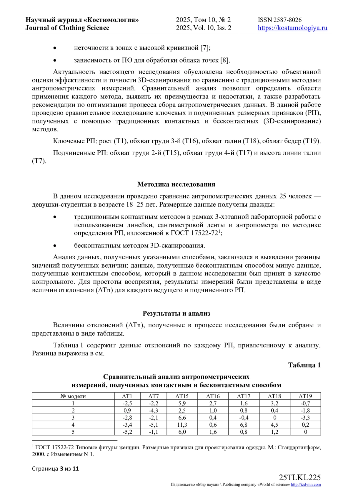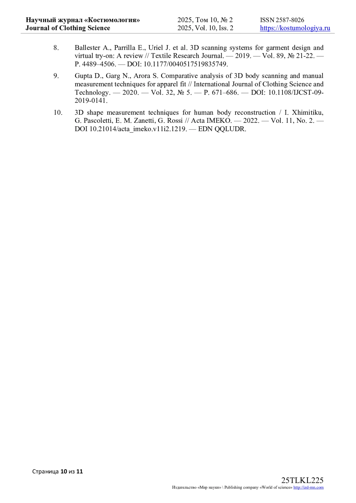 9. Gupta D., Garg N., Arora S.Comparative analysis of 3D body scanning and manual measurement techniques for apparel fit // International Journal of Clothing Science and Technology. - 2020. - Vol. 32, № 5. - P. 671-686. -. DOI: 10.1108/IJCST-09-2019-0141
