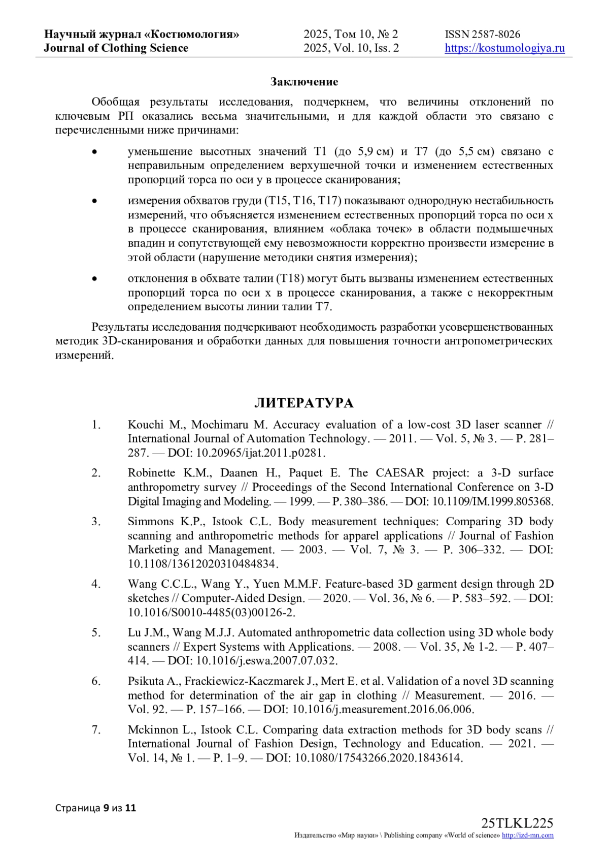 7. Mckinnon L., Istook C.L.Comparing data extraction methods for 3D body scans // International Journal of Fashion Design, Technology and Education. - 2021. - Vol. 14, № 1. - P. 1-9. -. DOI: 10.1080/17543266.2020.1843614