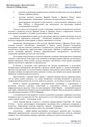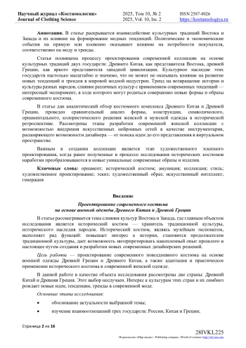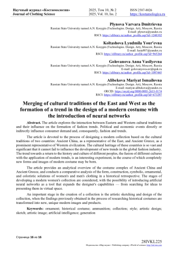 В статье раскрывается взаимодействие культурных традиций Востока и Запада и их влияние на формирование модных тенденций. Политические и экономические события на прямую или косвенно оказывают влияние на потребности покупателя, соответственно на моду и тренды. Статья посвящена процессу проектирования современной коллекции на основе культурных традиций двух государств: Древнего Китая, как представителя Востока, древней Греции, как яркого представителя западной цивилизации. Культурное наследие этих государств настолько масштабно и значимо, что не может не оказывать влияние на развитие новых тенденций и трендов в мировой модной индустрии. Тренд на возвращение истории и культуры разных народов, слияние различных культур с применением современных тенденций - интересный эксперимент, в ходе которого могут родиться совершенно новые формы и образы современного костюма. В статье дан аналитический обзор костюмного комплекса Древнего Китая и Древней Греции, проведен сравнительный анализ формы, конструкции, символического, орнаментального, колористического решения женской и мужской одежды в исторической ретроспективе. Рассмотрены этапы разработки современной женской коллекции с возможностью внедрения искусственных нейронных сетей в качестве инструментария, расширяющего возможности дизайнера - от поиска идеи до его представления в виртуальном пространстве. Важным в создании коллекции является этап художественного эскизного проектирования, когда ранее полученные в процессе исследования исторических костюмов наработки преобразовываются в новые уникальные современные образы и изделия.
