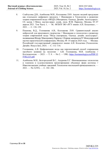 10. Голованева, А.В. Цифровизация моды как перспективный способ сокращения пагубного влияния на экологию / А.В. Голованева, М.И. Алибекова // Костюмология. - 2023. - Т. 8. - No 2. - URL: https://kostumologiya.ru/PDF/15IVKL223.pdf. EDN: MACKAX