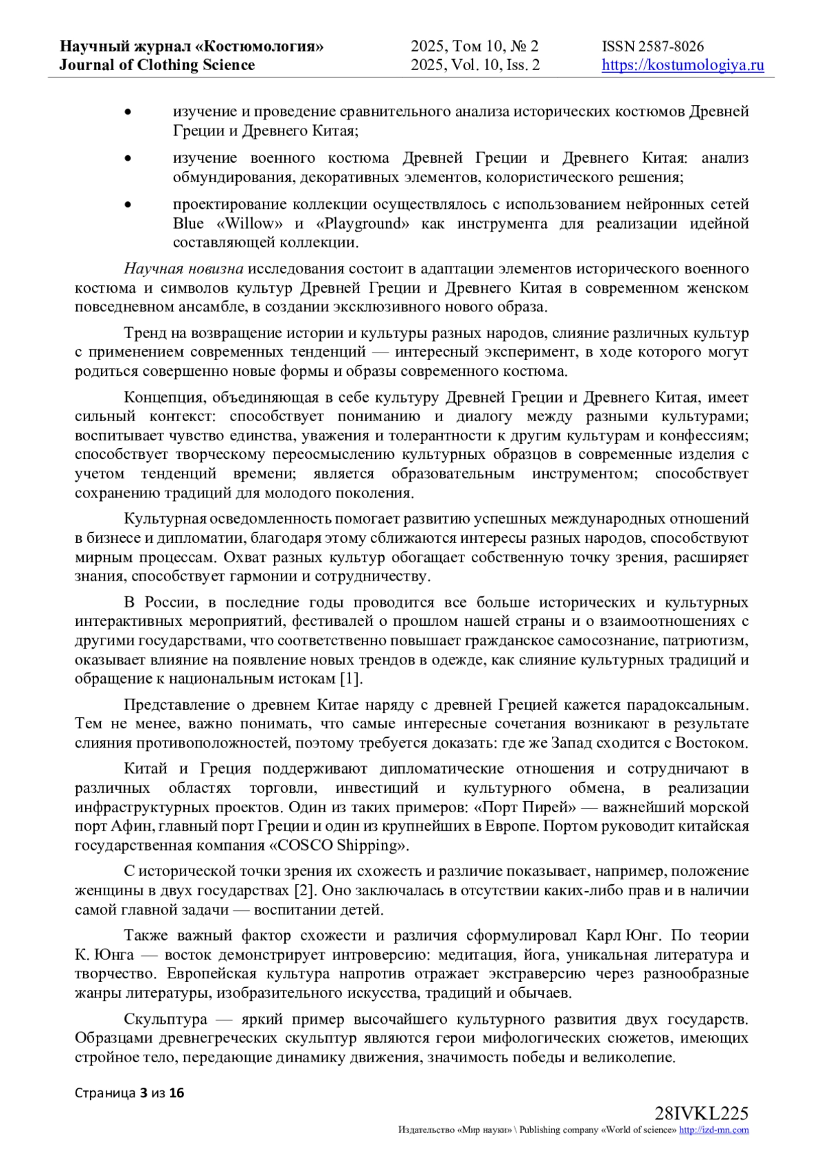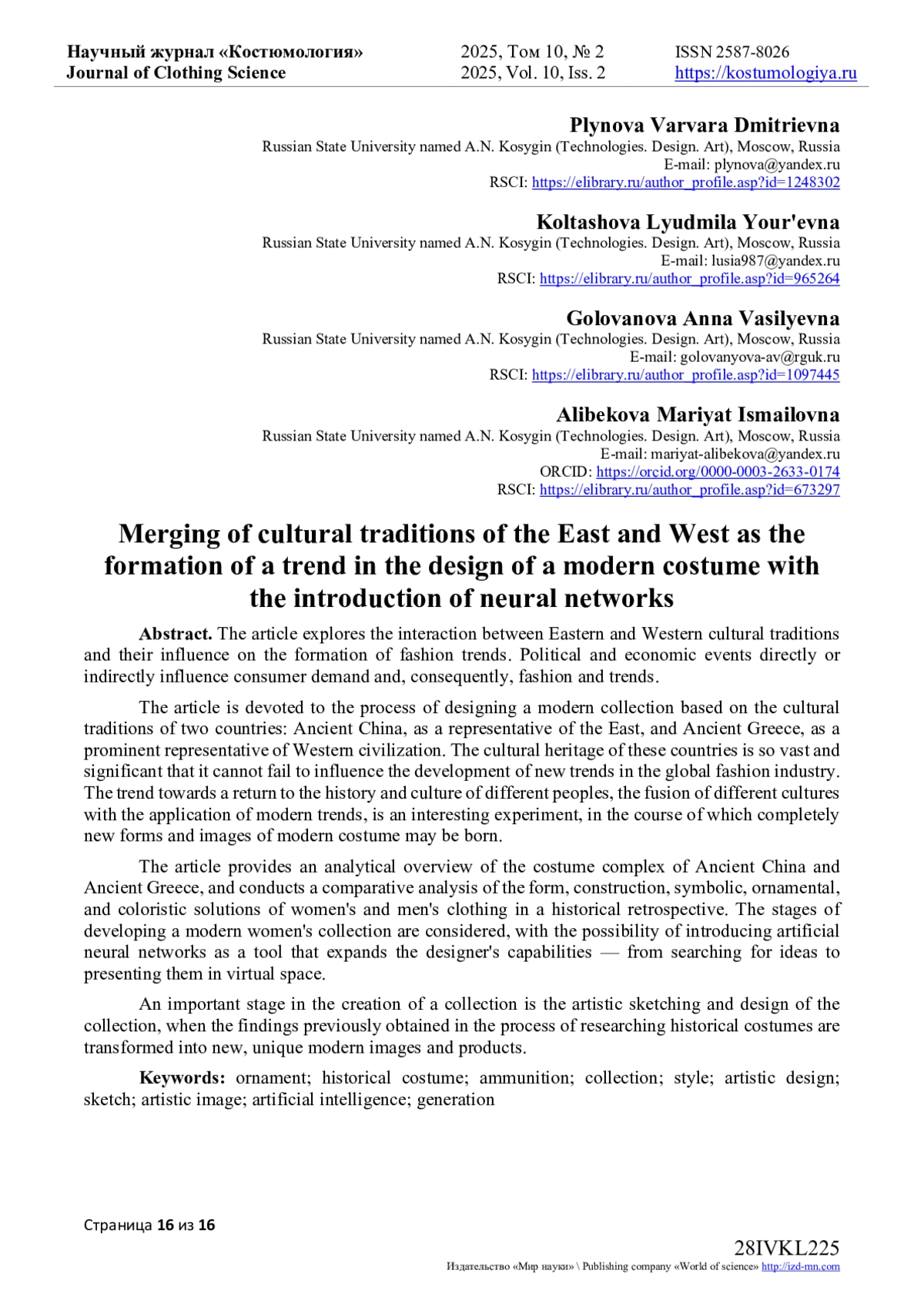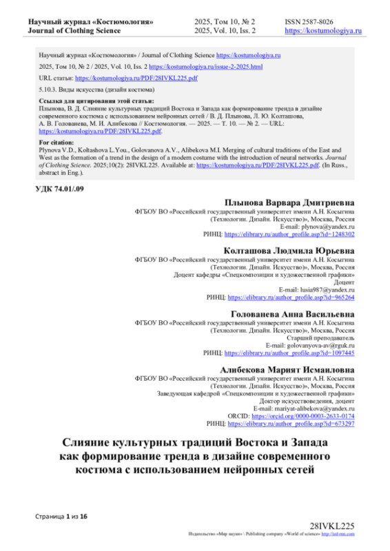 2. Плынова, В.Д., Фирсова Ю.Ю., Колташова Л.Ю. Синтез культур, как модная тенденция в современном костюме // Сборник научных трудов Всероссийской научной конференции с международным участием, посвященной 110-летию со дня рождения проф. Ф.Х. Садыковой: Сборник научных трудов конференции, Москва, 12 октября 2023 года. - Москва: Российский государственный университет имени А.Н. Косыгина (Технологии. Дизайн. Искусство), 2023. - С. 119-121. EDN: VNKLGT