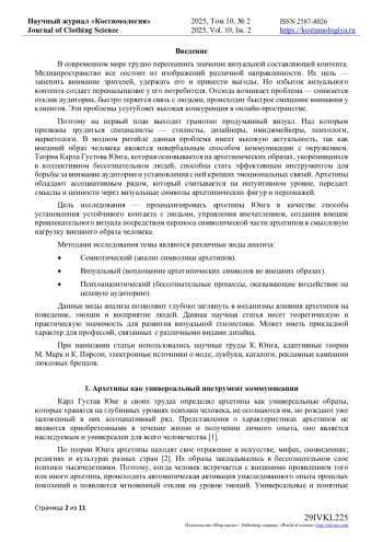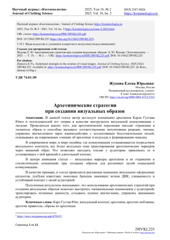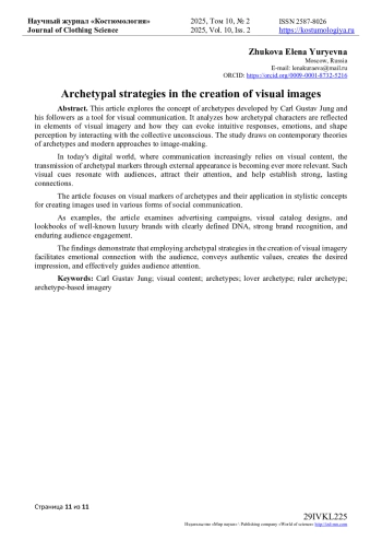 В данной статье автор исследует концепцию архетипов Карла Густава Юнга и последователей его теории в качестве инструмента визуальной коммуникации с людьми. Проводиться анализ того, как архетипические персонажи находят отражение в элементах образа и способны вызывать соответствующие интуитивные реакции, эмоции, управлять впечатлением через взаимодействие с коллективным бессознательным людей, основываясь на современных учениях об архетипах и подходах к формированию имиджа. В современном мире, в мире онлайна, где коммуникация устанавливается посредством визуального контента, все более актуальна тема транслирования архетипических маркеров через внешний образ. Что позволяет находить отклик у аудитории, привлекать ее и устанавливать с ней крепкий и длительный контакт. В центре внимания статьи - визуальные маркеры архетипов и их отражение в стилистических концепциях при создании образов для различных целей социальной коммуникации. В качестве примера, в статье приводятся рекламные кампании, визуальное оформление каталогов, лукбуки известных люксовых брендов, имеющих четкие ДНК, узнаваемость и устойчивый контакт с своей аудиторией. Полученные результаты показывают, что использование архетипических стратегий при создании визуальных образов помогает выстроить эмоциональные взаимосвязи с аудиторией, транслировать истинные ценности, создавать нужное впечатление, управлять вниманием аудитории.