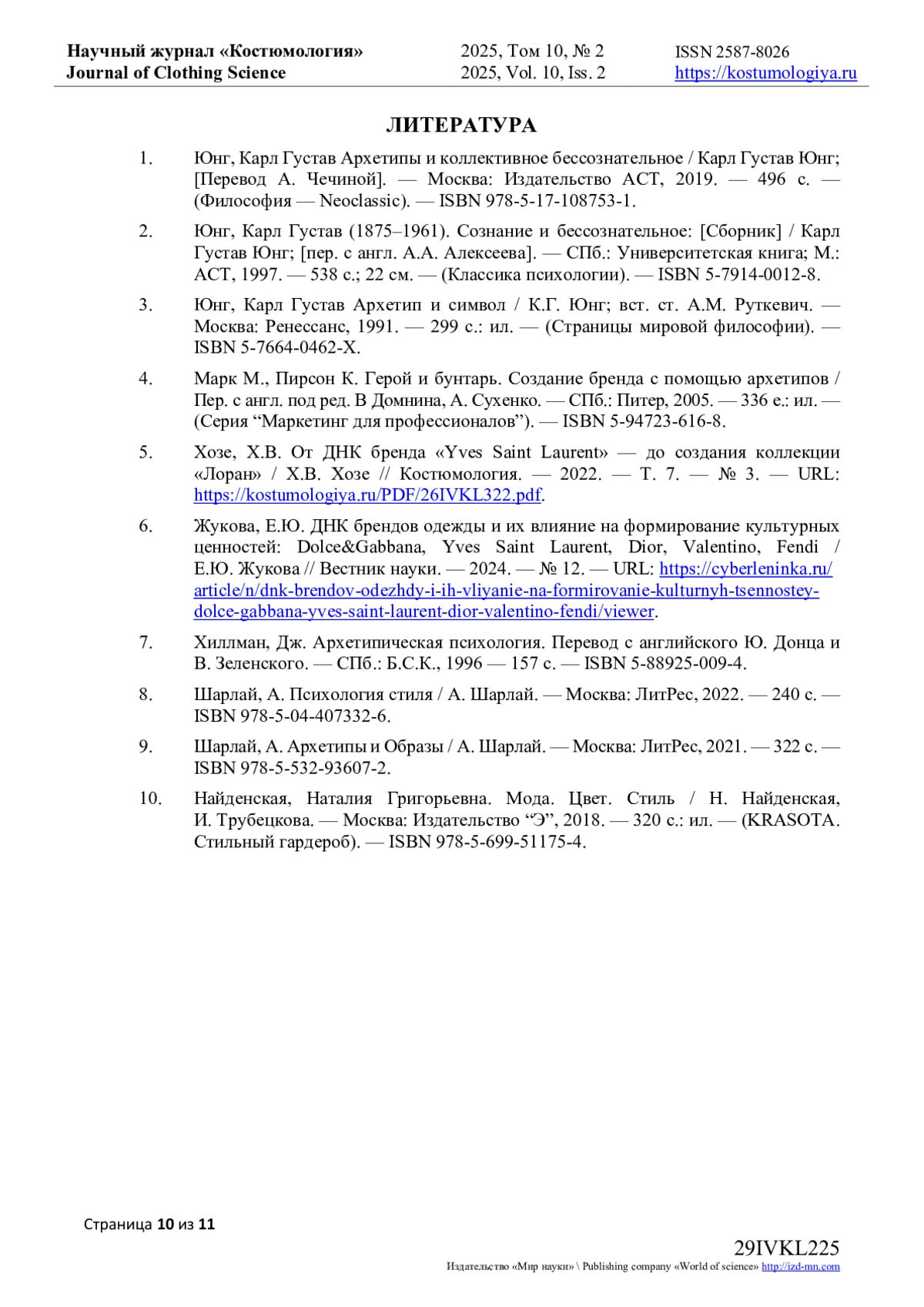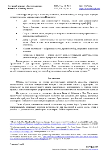6. Жукова, Е.Ю. ДНК брендов одежды и их влияние на формирование культурных ценностей: Dolce&Gabbana, Yves Saint Laurent, Dior, Valentino, Fendi / Е.Ю. Жукова // Вестник науки. - 2024. - № 12. - URL: https://cyberleninka.ru/article/n/dnk-brendov-odezhdy-i-ih-vliyanie-na-formirovanie-kulturnyh-tsennostey-dolce-gabbana-yves-saint-laurent-dior-valentino-fendi/viewer.