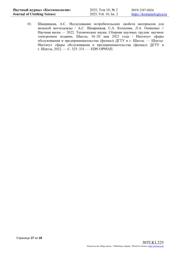 10. Шамрицкая, А.С. Исследование потребительских свойств материалов для женской мотоодежды / А.С. Шамрицкая, С.А. Колесник, Л.А. Осипенко // Научная весна - 2022. Технические науки: Сборник научных трудов: научное электронное издание, Шахты, 16-20 мая 2022 года / Институт сферы обслуживания и предпринимательства (филиал) ДГТУ в г. Шахты. - Шахты: Институт сферы обслуживания и предпринимательства (филиал) ДГТУ в г. Шахты, 2022. - С. 325-331. EDN: OPNOZI