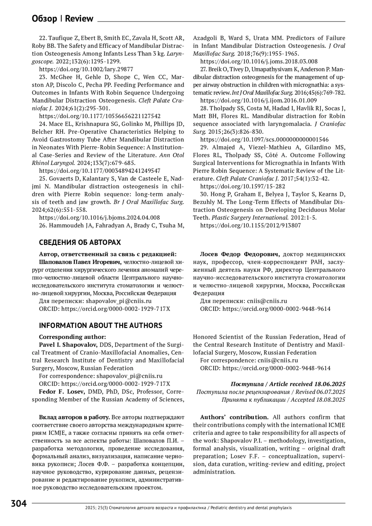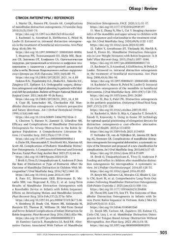 Заключение. Дистракционный остеогенез нижней челюсти - надежный метод лечения недоразвития нижней челюсти у детей и подростков при незавершенном росте лицевого скелета. Внутриротовой доступ предпочтителен при умеренных деформациях благодаря лучшим эстетическим результатам и меньшему количеству осложнений. Тогда как внеротовой доступ обоснован при тяжелых дефектах, требующих максимального удлинения или сложной коррекции вектора при выраженном ограничении открывания рта. Предложены клинические рекомендации по индивидуализации выбора хирургического доступа с учетом степени деформации, анатомических ограничений и эстетических факторов.
