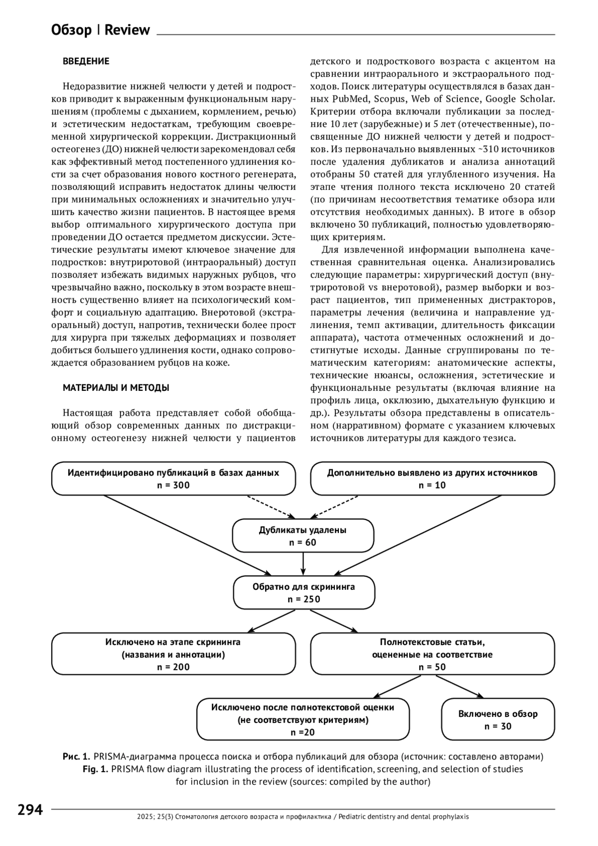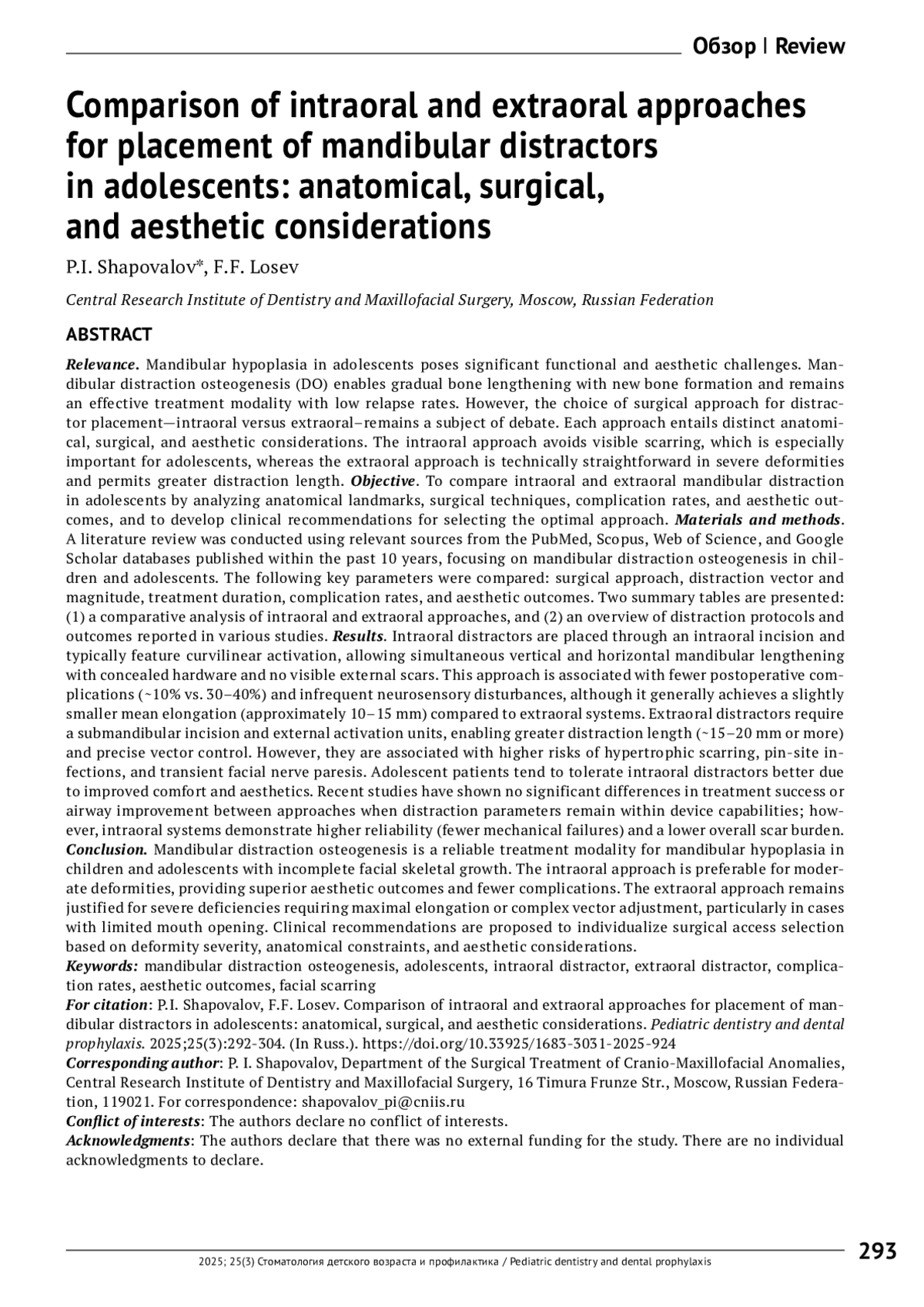 Материалы и методы. Проведен обзор литературы с использованием актуальных источников, представленных в базе PubMed, а также данные из Scopus, Web of Science и Google Scholar за последние 10 лет, посвященных дистракционному остеогенезу нижней челюсти у детей и подростков. Сравнены ключевые параметры: хирургический доступ, вектор и объем дистракции, длительность лечения, частота осложнений и эстетические результаты. Представлены две сводные таблицы: сравнительная характеристика внутриротового и внеротового доступа, обзор протоколов дистракции и исходов, приведенных в различных исследованиях.
