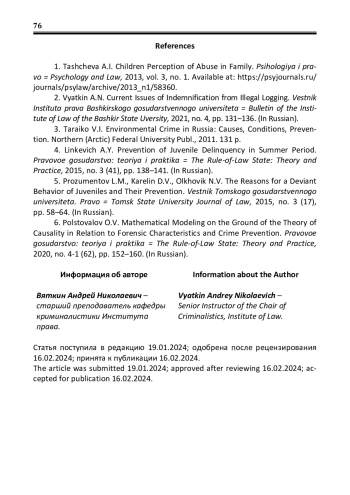 1. Тащёва А.И. Восприятие детьми семейного насилия / А.И. Тащёва, С.В. Гриднева // Психология и право. - 2013. - Т. 3, № 1. - URL: https://psyjournals.ru/journals/psylaw/archive/2013_n1/58360 (дата обращения: 09.01.2024). EDN: PYEBHN
