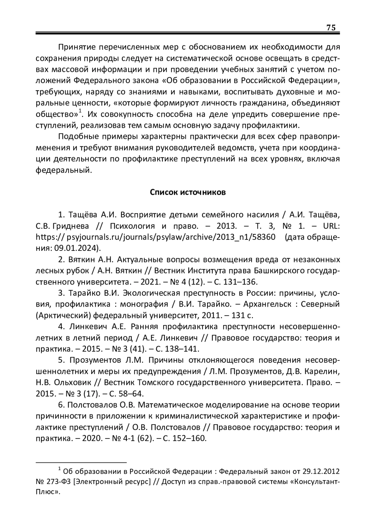 5. Прозументов Л.М. Причины отклоняющегося поведения несовершеннолетних и меры их предупреждения / Л.М. Прозументов, Д.В. Карелин, Н.В. Ольховик // Вестник Томского государственного университета. Право. - 2015. - № 3 (17). - С. 58-64. EDN: ULZAZN