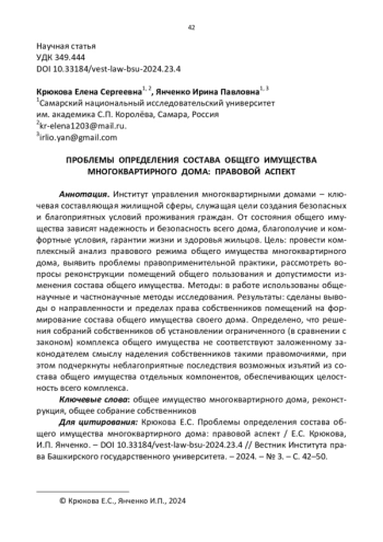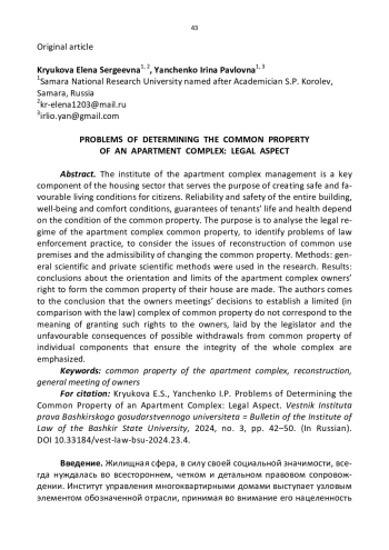 Институт управления многоквартирными домами – ключевая составляющая жилищной сферы, служащая цели создания безопасных и благоприятных условий проживания граждан. От состояния общего имущества зависят надежность и безопасность всего дома, благополучие и комфортные условия, гарантии жизни и здоровья жильцов. Цель: провести комплексный анализ правового режима общего имущества многоквартирного дома, выявить проблемы правоприменительной практики, рассмотреть вопросы реконструкции помещений общего пользования и допустимости изменения состава общего имущества. Методы: в работе использованы общенаучные и частнонаучные методы исследования. Результаты: сделаны выводы о направленности и пределах права собственников помещений на формирование состава общего имущества своего дома. Определено, что решения собраний собственников об установлении ограниченного (в сравнении с законом) комплекса общего имущества не соответствуют заложенному законодателем смыслу наделения собственников такими правомочиями, при этом подчеркнуты неблагоприятные последствия возможных изъятий из состава общего имущества отдельных компонентов, обеспечивающих целостность всего комплекса