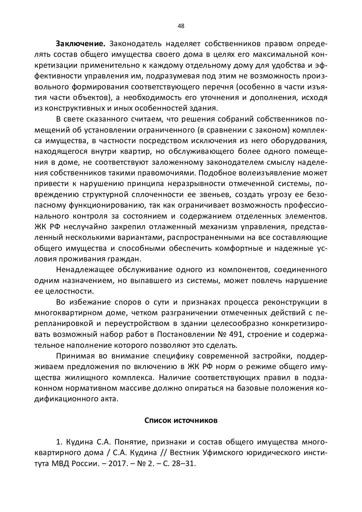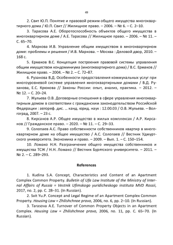 1. Кудина С.А. Понятие, признаки и состав общего имущества многоквартирного дома / С.А. Кудина // Вестник Уфимского юридического института МВД России. - 2017. - № 2. - С. 28-31. EDN: YQPZLX