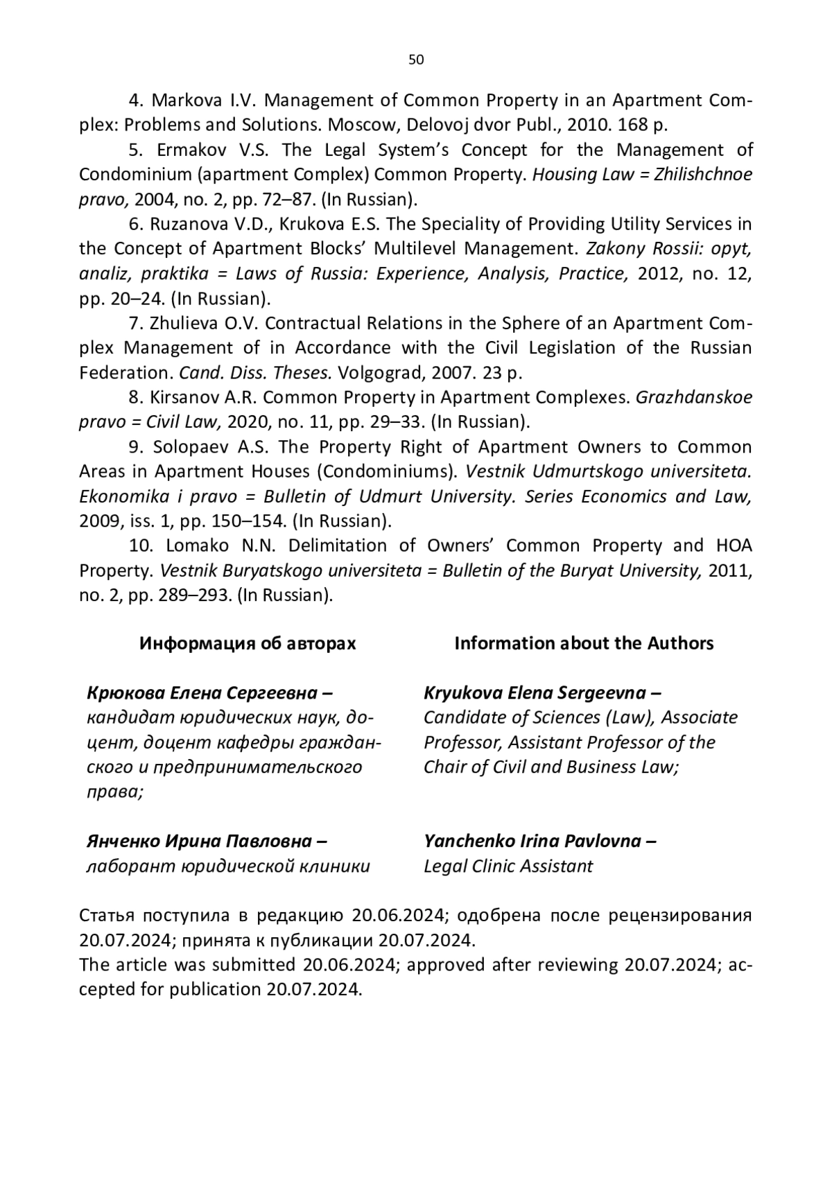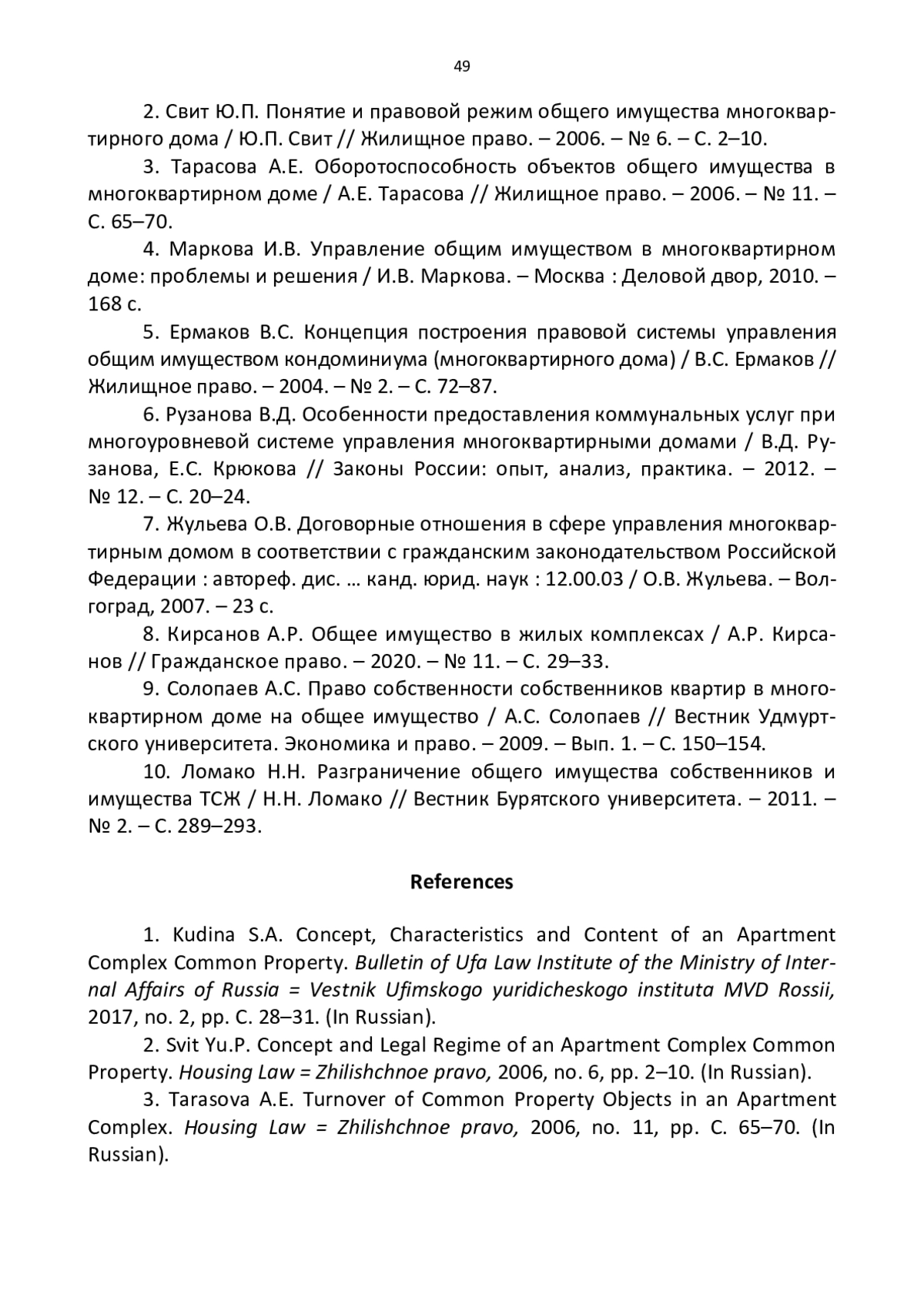 8. Кирсанов А.Р. Общее имущество в жилых комплексах / А.Р. Кирсанов // Гражданское право. - 2020. - № 11. - С. 29-33.