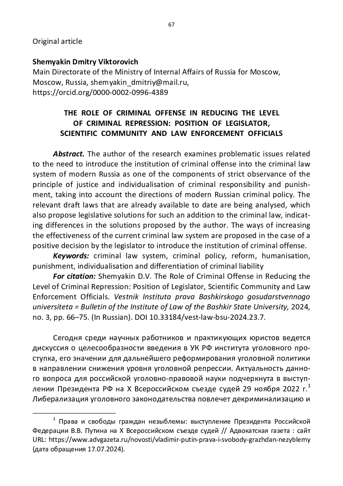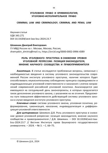 Сегодня среди научных работников и практикующих юристов ведется дискуссия о целесообразности введения в УК РФ института уголовного проступка, его значении для дальнейшего реформирования уголовной политики в направлении снижения уровня уголовной репрессии. Актуальность данного вопроса для российской уголовно-правовой науки подчеркнута в выступлении Президента РФ на X Всероссийском съезде судей 29 ноября 2022 г