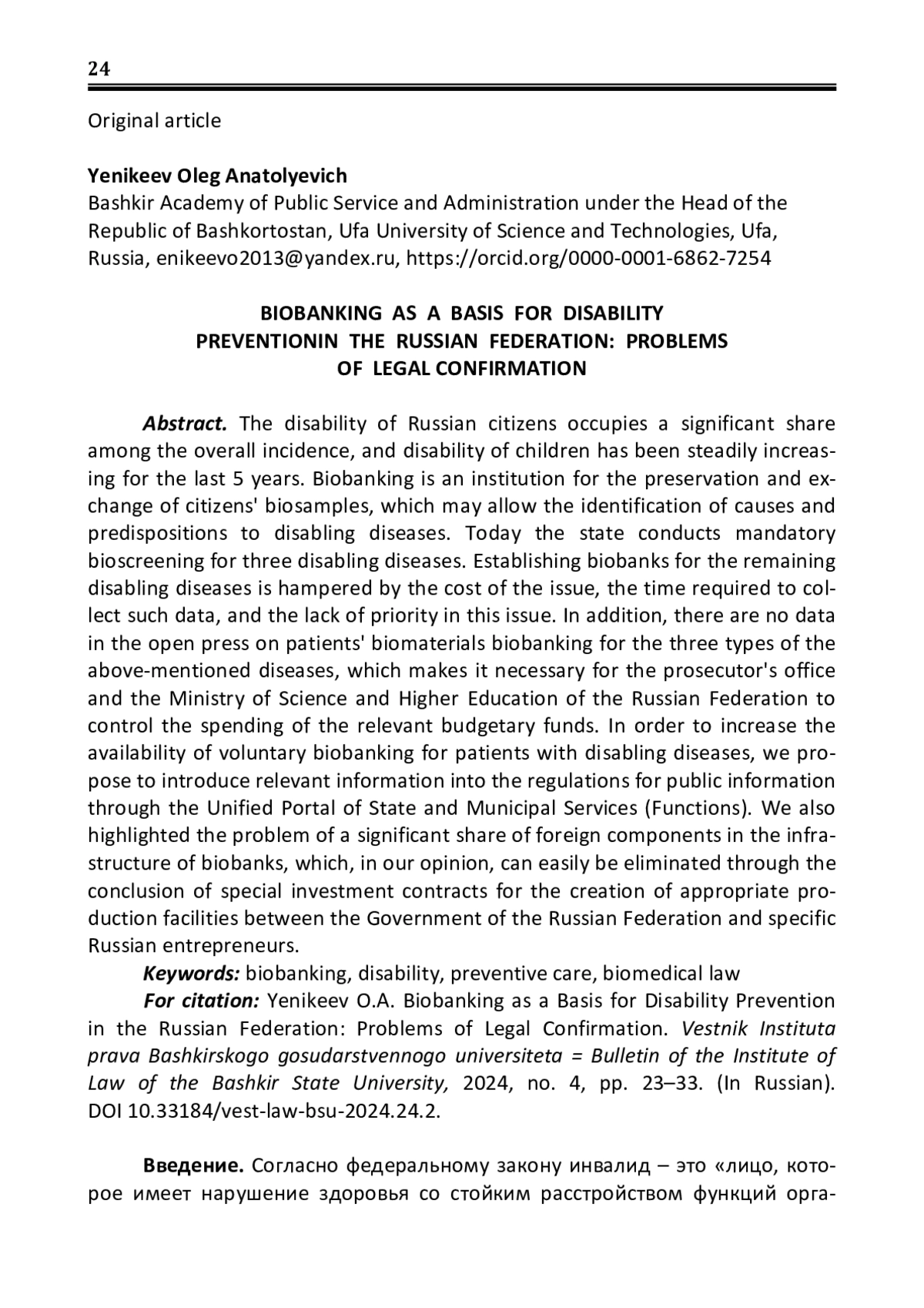 Инвалидизация граждан России занимает существенную долю среди общей заболеваемости, а инвалидизация детей неуклонно растет последние 5 лет. Биобанкирование – это институт сохранения и обмена биообразцов граждан, который может позволить выявить причины и предрасположенности к инвалидизирующим заболеваниям. Сегодня государство проводит обязательное биобанкирование по трем инвалидизирующим заболеваниям. Создание биобанков по остальным заболеваниям, вызывающим инвалидность, затрудняется стоимостью вопроса, временем, необходимым для сбора таких данных, и отсутствием приоритетности в решении данного вопроса. Кроме того, в открытой печати отсутствуют данные о биобанкировании биоматериалов пациентов по трем видам вышеупомянутых заболеваний, что обуславливает необходимость контроля за расходованием соответствующих бюджетных средств со стороны прокуратуры и Министерства науки и высшего образования РФ. Для повышения доступности добровольного биобанкирования пациентов с инвалидизирующими заболеваниями мы предлагаем внести соответствующую информацию в регламенты информирования населения через Единый портал государственных и муниципальных услуг (функций). Также нами подчеркнута проблема существенной доли иностранных комплектующих в инфраструктуре биобанков, что, на наш взгляд, легко может быть устранено посредством заключения специальных инвестиционных контрактов по созданию соответствующих производств между Правительством РФ и конкретными российскими предпринимателями
