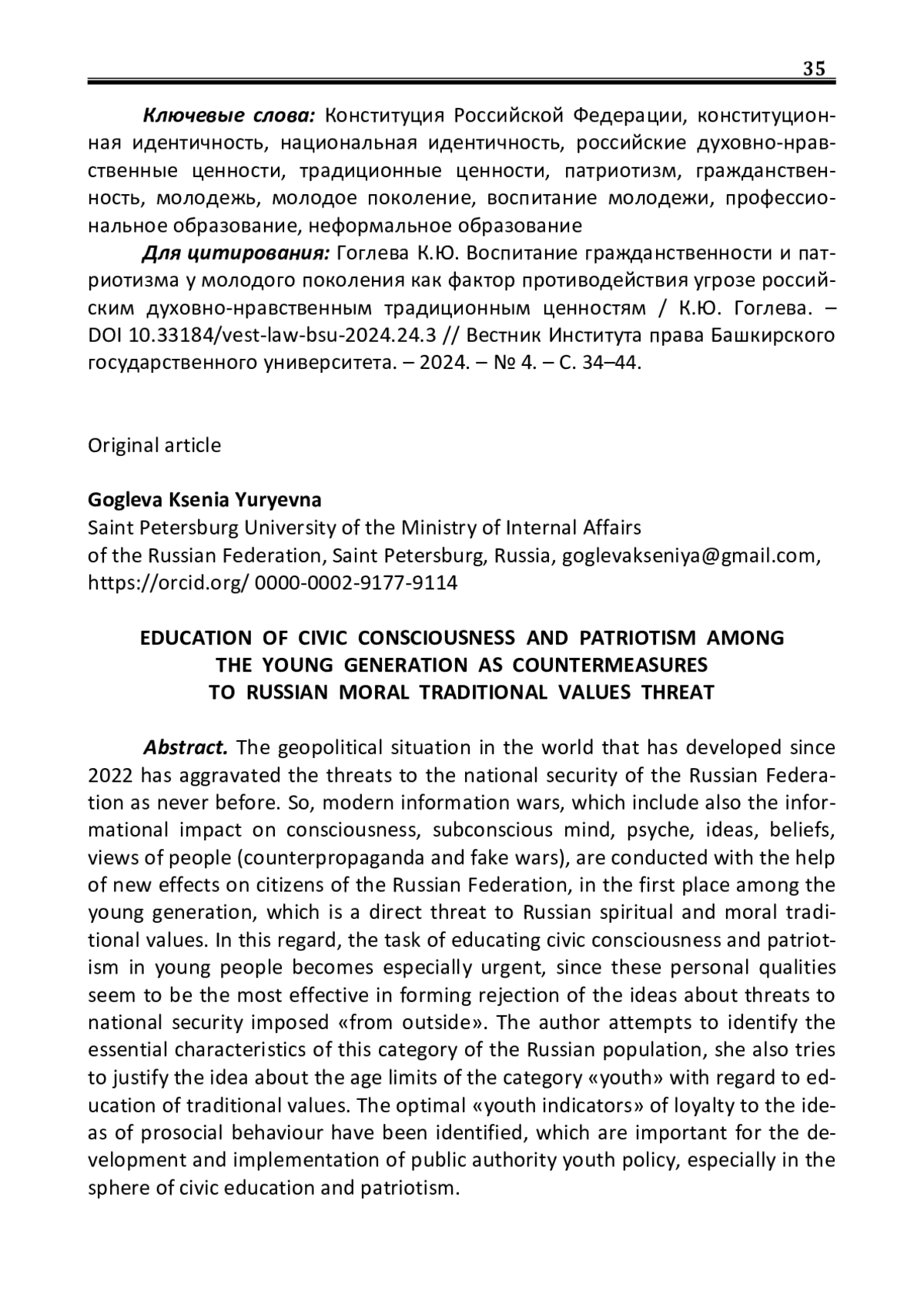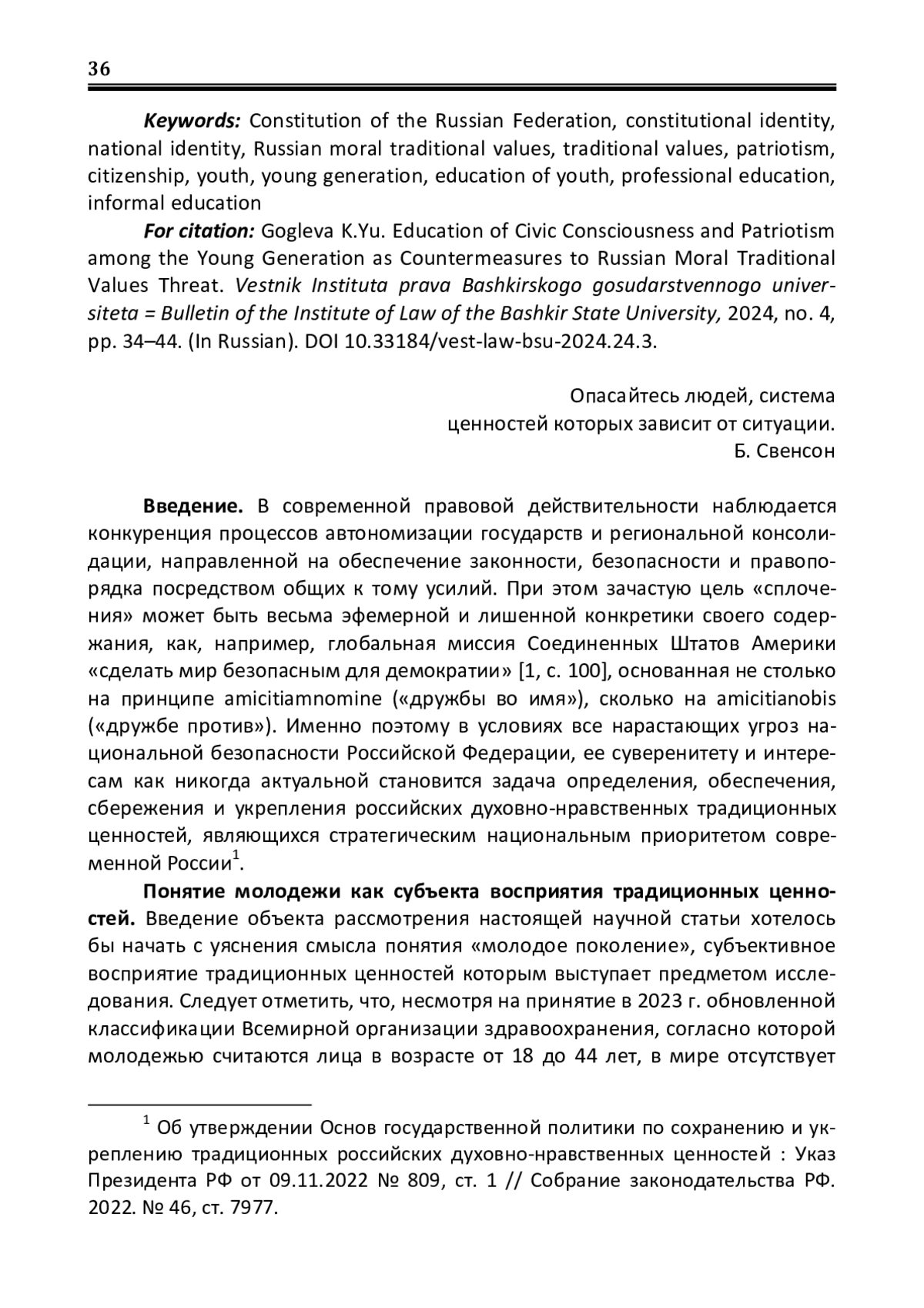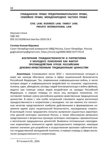 Сложившаяся после 2022 г. геополитическая ситуация в мире как никогда обострила угрозы в сфере национальной безопасности Российской Федерации. Так, современные информационные войны, в число которых входит и информационное воздействие на сознание, подсознание, психику, идеи, убеждения, взгляды людей (контрпропаганда и войны фейков), ведутся при помощи новых видов воздействия на граждан Российской Федерации, в первую очередь из числа лиц молодого поколения, что составляет прямую угрозу российским духовно-нравственным традиционным ценностям. В связи с чем особо актуальной становится задача воспитания гражданственности и патриотизма у молодежи, так как именно эти личностные качества представляются наиболее действенными в формировании неприятия идеям угроз национальной безопасности, насаждаемым «извне». В настоящей статье предпринята попытка выявления сущностных характеристик данной категории населения России, а также обоснования авторского представления о возрастных границах категории «молодежь» применительно к воспитанию традиционных ценностей. Выявлены оптимальные «молодежные индикаторы» лояльности идеям просоциального поведения, имеющие важное значение для разработки и осуществления органами публичной власти государственной молодежной политики, в первую очередь в сфере воспитания гражданственности и патриотизма