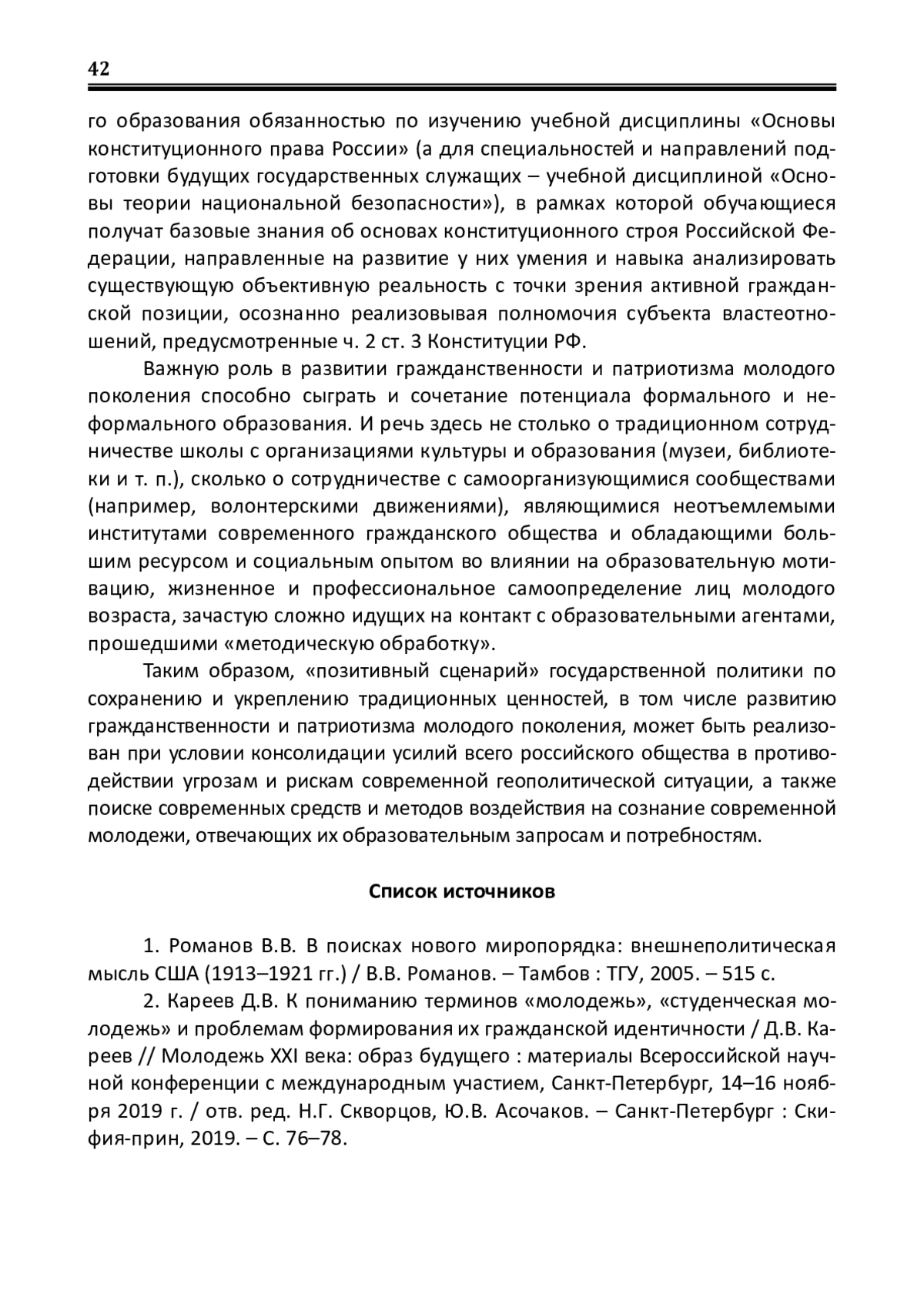 2. Кареев Д.В. К пониманию терминов “молодежь”, “студенческая молодежь” и проблемам формирования их гражданской идентичности / Д.В. Кареев // Молодежь XXI века: образ будущего: материалы Всероссийской научной конференции с международным участием, Санкт-Петербург, 14-16 ноября 2019 г. / отв. ред. Н.Г. Скворцов, Ю.В. Асочаков. - Санкт-Петербург: Скифия-прин, 2019. - С. 76-78. EDN: VFFBRR