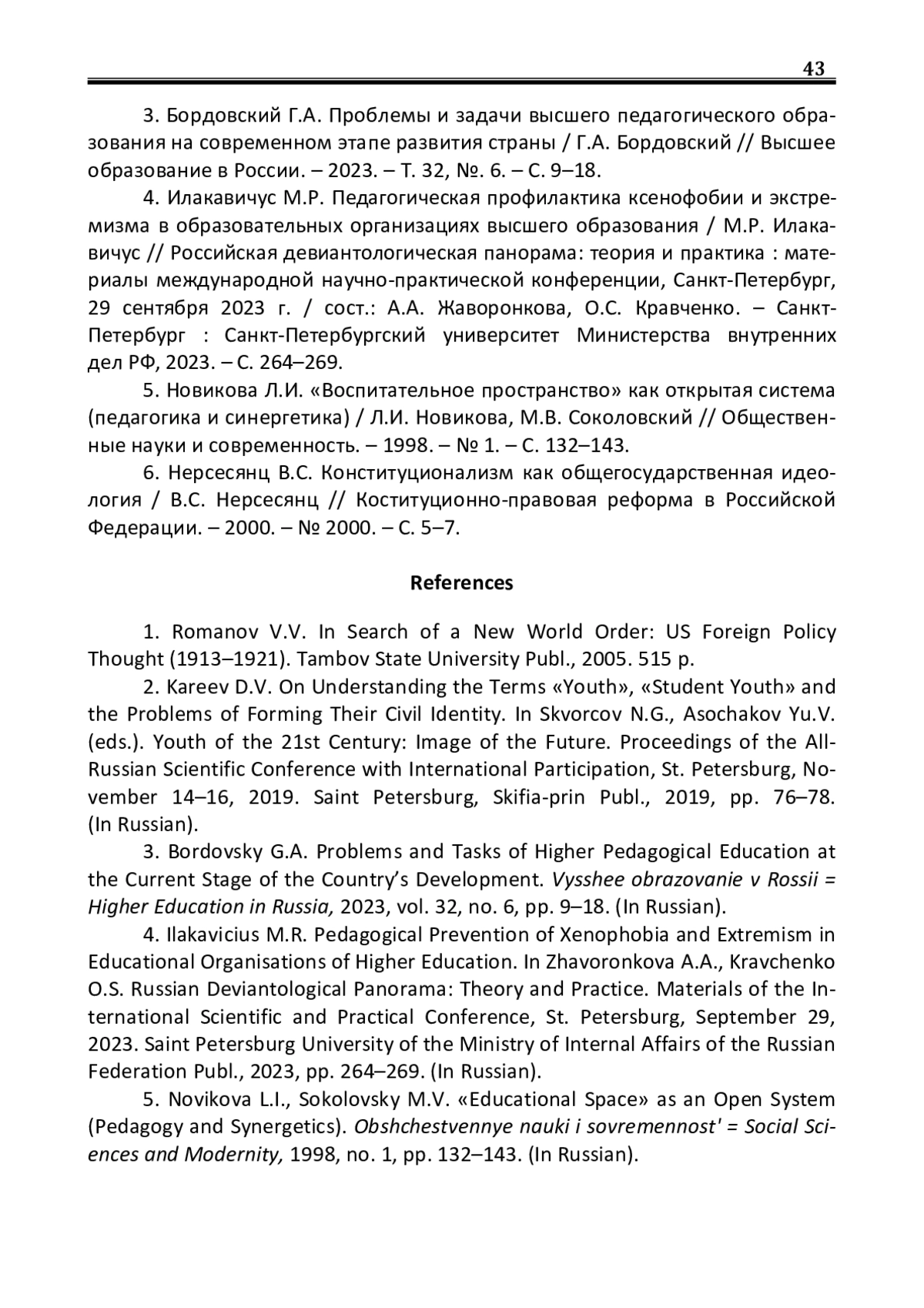3. Бордовский Г.А. Проблемы и задачи высшего педагогического образования на современном этапе развития страны / Г.А. Бордовский // Высшее образование в России. - 2023. - Т. 32, №. 6. - С. 9-18. EDN: JKLOHJ
