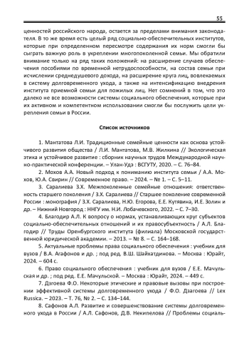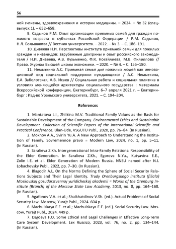 9. Садыков Р.М. Опыт организации приемных семей для граждан пожилого возраста в субъектах Российской Федерации / Р.М. Садыков, Н.Л. Большакова // Вестник университета. - 2022. - № 3. - С. 186-191. EDN: AILBGO